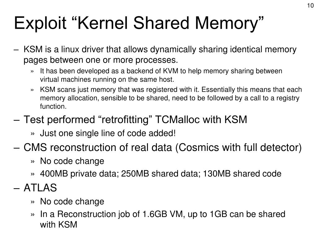 Exploit “Kernel Shared Memory” • KSM is a linux driver that allows dynamically sharing identical memory pages between one or more processes. • It has been developed as a backend of KVM to help memory sharing between virtual machines running on the same host. • KSM scans just memory that was registered with it. Essentially this means that each memory allocation, sensible to be shared, need to be followed by a call to a registry function. • Test performed “retrofitting” TCMalloc with KSM • Just one single line of code added! • CMS reconstruction of real data (Cosmics with full detector) • No code change • 400MB private data; 250MB shared data; 130MB shared code • ATLAS • No code change • In a Reconstruction job of 1.6GB VM, up to 1GB can be shared with KSM