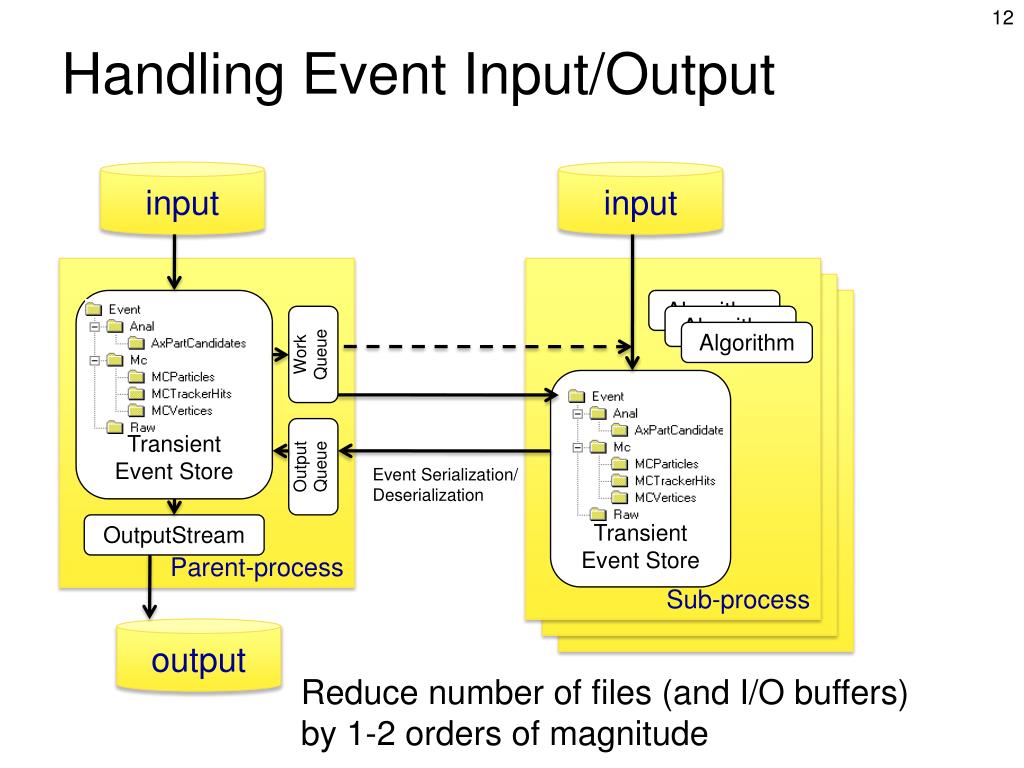 Handling Event Input/Output input input Parent-process Sub-process Transient Event Store Algorithm Algorithm Algorithm Work Queue Transient Event Store Output Queue Event Serialization/ Deserialization OutputStream output Reduce number of files (and I/O buffers) by 1-2 orders of magnitude