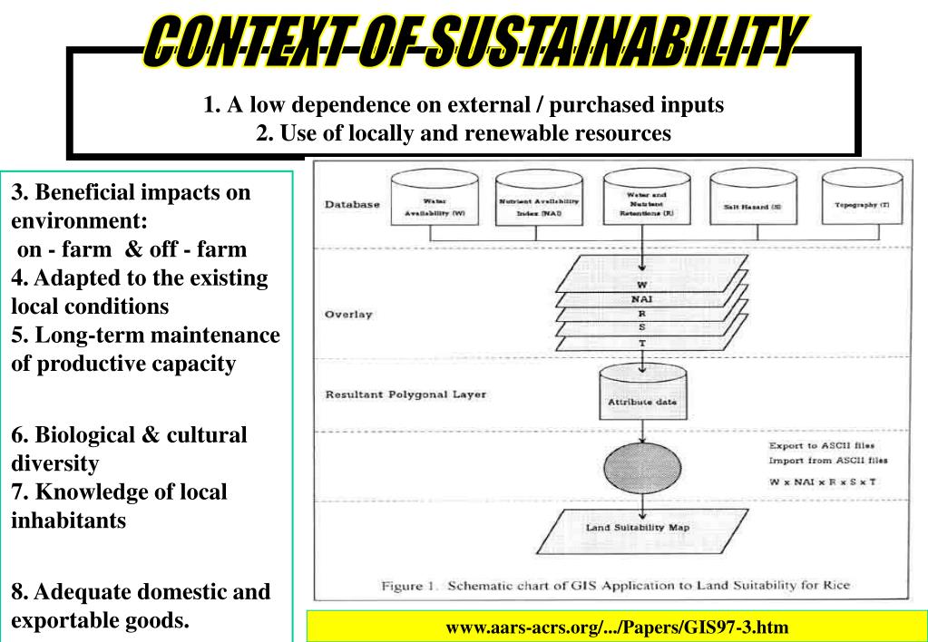 CONTEXT OF SUSTAINABILITY 1. A low dependence on external / purchased inputs2. Use of locally and renewable resources 3. Beneficial impacts on environment: on - farm & off - farm4. Adapted to the existing local conditions5. Long-term maintenance of productive capacity 6. Biological & cultural diversity7. Knowledge of local inhabitants 8. Adequate domestic and exportable goods. www.aars-acrs.org/.../Papers/GIS97-3.htm