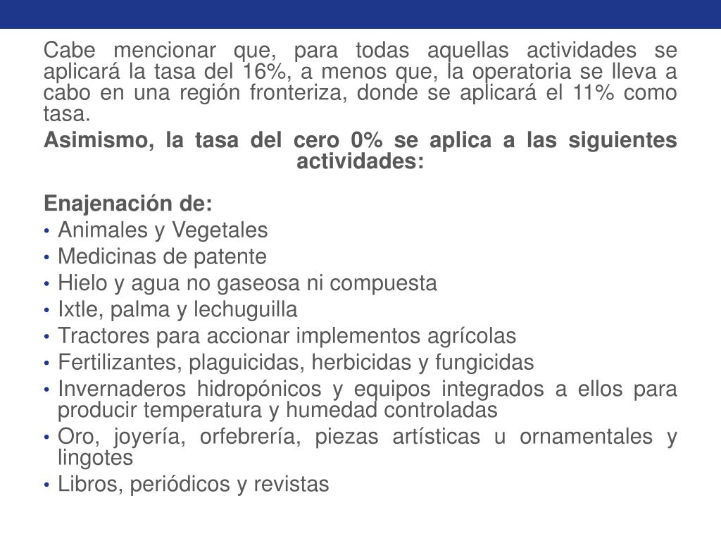 Cabe mencionar que, para todas aquellas actividades se aplicará la tasa del 16%, a menos que, la operatoria se lleva a cabo en una región fronteriza, donde se aplicará el 11% como tasa. Asimismo, la tasa del cero 0% se aplica a las siguientes actividades:Enajenación de: • Animales y Vegetales • Medicinas de patente • Hielo y agua no gaseosa ni compuesta • Ixtle, palma y lechuguilla • Tractores para accionar implementos agrícolas • Fertilizantes, plaguicidas, herbicidas y fungicidas • Invernaderos hidropónicos y equipos integrados a ellos para producir temperatura y humedad controladas • Oro, joyería, orfebrería, piezas artísticas u ornamentales y lingotes • Libros, periódicos y revistas