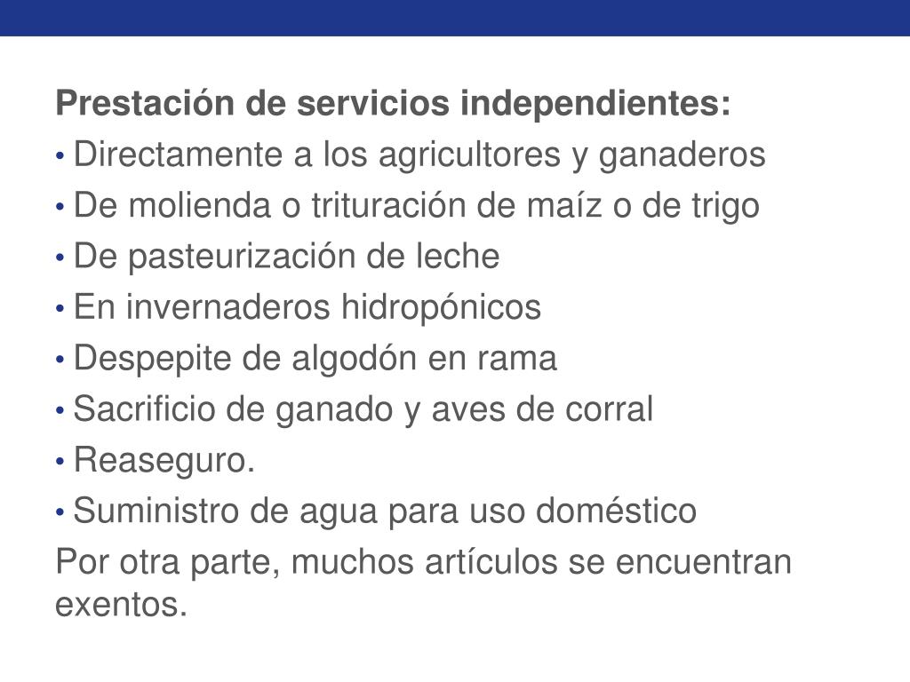 Prestación de servicios independientes: • Directamente a los agricultores y ganaderos • De molienda o trituración de maíz o de trigo • De pasteurización de leche • En invernaderos hidropónicos • Despepite de algodón en rama • Sacrificio de ganado y aves de corral • Reaseguro. • Suministro de agua para uso doméstico Por otra parte, muchos artículos se encuentran exentos.