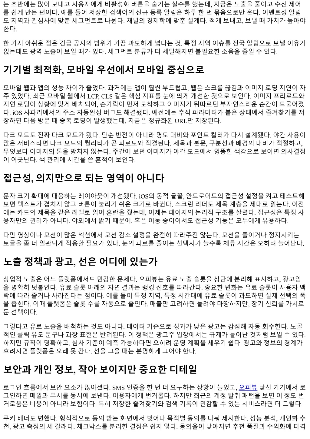는초반에는많이보내고사용자에게비활성화버튼을숨기는실수를했는데, 지금은노출을줄이고수신제어 를쉽게만든편이다. 예를들어저장한검색어의신규등록알림은하루한번묶음으로만온다. 이벤트성알림 도지역과관심사에맞춘세그먼트로나뉜다. 채널의경제학에맞춘설계다. 적게보내고, 보낼때가치가높아야 한다. 한가지아쉬운점은긴급공지의범위가가끔과도하게넓다는것. 특정지역이슈를전국알림으로보낼이유가 없는데도광역노출이보일때가있다. 세그먼트분류가더세밀해지면불필요한소음을줄일수있다. 기기별최적화, 모바일우선에서모바일중심으로 모바일웹과앱의성능차이가줄었다. 과거에는앱이훨씬부드럽고, 웹은스크롤끊김과이미지로딩지연이자 주있었다. 최근모바일웹에서 LCP, CLS 같은핵심지표를눈에띄게개선한것으로보인다. 이미지프리로드와 지연로딩이상황에맞게배치되어, 손가락이먼저도착하고이미지가뒤따르던부자연스러운순간이드물어졌 다. iOS 사파리에서의주소자동완성버그도해결됐다. 예전에는추적파라미터가붙은상태에서즐겨찾기를저 장하면다음방문때중복로딩이발생했는데, 지금은정규화된 URL만저장된다. 다크모드도진짜다크모드가됐다. 단순반전이아니라명도대비와포인트컬러가다시설계됐다. 야간사용이 많은서비스라면다크모드의퀄리티가곧피로도와직결된다. 제목과본문, 구분선과배경의대비가적절하고, 무엇보다이미지의톤을망치지않는다. 주간에보던이미지가야간모드에서엉뚱한색감으로보이면의사결정 이어긋난다. 색관리에시간을쓴흔적이보인다. 접근성, 의지만으로되는영역이아니다 문자크기확대에대응하는레이아웃이개선됐다. iOS의동적글꼴, 안드로이드의접근성설정을켜고테스트해 보면텍스트가겹치지않고버튼이눌리기쉬운크기로바뀐다. 스크린리더도제목계층을제대로읽는다. 이전 에는카드의제목을같은레벨로읽어혼란을줬는데, 이제는페이지의논리적구조를살렸다. 접근성은특정사 용자만의권리가아니다. 야외에서밝기때문에, 혹은이동중이어서도접근성기능은모두에게유용하다. 다만영상이나모션이많은섹션에서모션감소설정을완전히따라주진않는다. 모션을줄이거나정지시키는 토글을좀더일관되게적용할필요가있다. 눈의피로를줄이는선택지가늘수록체류시간은오히려늘어난다. 노출정책과광고, 선은어디에있는가 상업적노출은어느플랫폼에서도민감한문제다. 오피뷰는유료노출슬롯을상단에분리해표시하고, 광고임 을명확히덧붙인다. 유료슬롯아래의자연결과는랭킹신호를따라간다. 중요한변화는유료슬롯이사용자맥 락에따라줄거나사라진다는점이다. 예를들어특정지역, 특정시간대에유료슬롯이과도하면실제선택의폭 을좁힌다. 이때플랫폼은슬롯수를자동으로줄인다. 매출만고려하면늘려야마땅하지만, 장기신뢰를가치로 둔선택이다. 그렇다고유료노출을배척하는것도아니다. 데이터기준으로성과가낮은광고는감점해자동회수한다. 노골 적인클릭유도문구나과장표현은반려된다. 이정책은광고주입장에서는규제가늘어난것처럼보일수있다. 하지만규칙이명확하고, 심사기준이예측가능하다면오히려운영계획을세우기쉽다. 광고와정보의경계가 흐려지면플랫폼은오래못간다. 선을그을때는분명하게그어야한다. 보안과개인정보, 작아보이지만중요한디테일 로그인흐름에서보안요소가많아졌다. SMS 인증을한번더요구하는상황이늘었고, 오피뷰낯선기기에서로 그인하면메일과푸시를동시에보낸다. 이용자에게번거롭다. 하지만최근의계정탈취패턴을보면이정도번 거로움은비용이아니라보험이다. 특히저장한즐겨찾기와검색기록이민감할수있는서비스라면더그렇다. 쿠키배너도변했다. 형식적으로동의받는화면에서벗어나목적별동의를나눠제시한다. 성능분석, 개인화추 천, 광고측정의세갈래다. 체크박스를분리한결정은쉽지않다. 동의율이낮아지면추천품질과수익화에타격