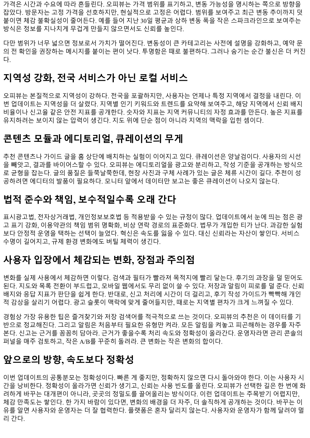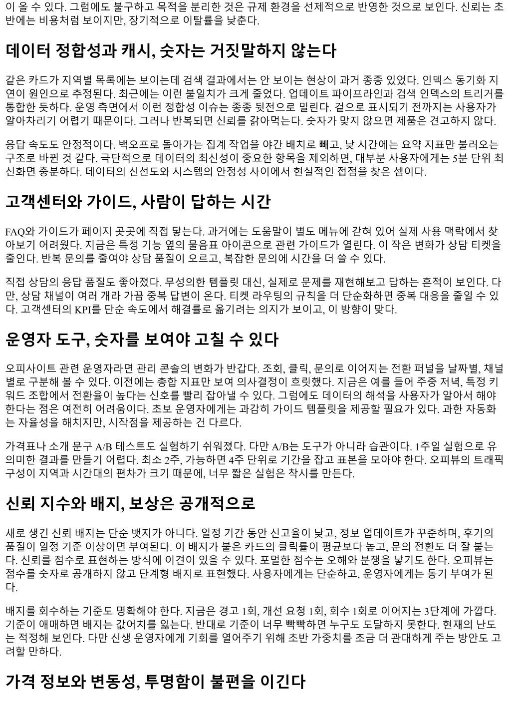 이올수있다. 그럼에도불구하고목적을분리한것은규제환경을선제적으로반영한것으로보인다. 신뢰는초 반에는비용처럼보이지만, 장기적으로이탈률을낮춘다. 데이터정합성과캐시, 숫자는거짓말하지않는다 같은카드가지역별목록에는보이는데검색결과에서는안보이는현상이과거종종있었다. 인덱스동기화지 연이원인으로추정된다. 최근에는이런불일치가크게줄었다. 업데이트파이프라인과검색인덱스의트리거를 통합한듯하다. 운영측면에서이런정합성이슈는종종뒷전으로밀린다. 겉으로표시되기전까지는사용자가 알아차리기어렵기때문이다. 그러나반복되면신뢰를갉아먹는다. 숫자가맞지않으면제품은견고하지않다. 응답속도도안정적이다. 백오프로돌아가는집계작업을야간배치로빼고, 낮시간에는요약지표만불러오는 구조로바뀐것같다. 극단적으로데이터의최신성이중요한항목을제외하면, 대부분사용자에게는 5분단위최 신화면충분하다. 데이터의신선도와시스템의안정성사이에서현실적인접점을찾은셈이다. 고객센터와가이드, 사람이답하는시간 FAQ와가이드가페이지곳곳에직접닿는다. 과거에는도움말이별도메뉴에갇혀있어실제사용맥락에서찾 아보기어려웠다. 지금은특정기능옆의물음표아이콘으로관련가이드가열린다. 이작은변화가상담티켓을 줄인다. 반복문의를줄여야상담품질이오르고, 복잡한문의에시간을더쓸수있다. 직접상담의응답품질도좋아졌다. 무성의한템플릿대신, 실제로문제를재현해보고답하는흔적이보인다. 다 만, 상담채널이여러개라가끔중복답변이온다. 티켓라우팅의규칙을더단순화하면중복대응을줄일수있 다. 고객센터의 KPI를단순속도에서해결률로옮기려는의지가보이고, 이방향이맞다. 운영자도구, 숫자를보여야고칠수있다 오피사이트관련운영자라면관리콘솔의변화가반갑다. 조회, 클릭, 문의로이어지는전환퍼널을날짜별, 채널 별로구분해볼수있다. 이전에는총합지표만보여의사결정이흐릿했다. 지금은예를들어주중저녁, 특정키 워드조합에서전환율이높다는신호를빨리잡아낼수있다. 그럼에도데이터의해석을사용자가알아서해야 한다는점은여전히어려움이다. 초보운영자에게는과감히가이드템플릿을제공할필요가있다. 과한자동화 는자율성을해치지만, 시작점을제공하는건다르다. 가격표나소개문구 A/B 테스트도실험하기쉬워졌다. 다만 A/B는도구가아니라습관이다. 1주일실험으로유 의미한결과를만들기어렵다. 최소 2주, 가능하면 4주단위로기간을잡고표본을모아야한다. 오피뷰의트래픽 구성이지역과시간대의편차가크기때문에, 너무짧은실험은착시를만든다. 신뢰지수와배지, 보상은공개적으로 새로생긴신뢰배지는단순뱃지가아니다. 일정기간동안신고율이낮고, 정보업데이트가꾸준하며, 후기의 품질이일정기준이상이면부여된다. 이배지가붙은카드의클릭률이평균보다높고, 문의전환도더잘붙는 다. 신뢰를점수로표현하는방식에이견이있을수있다. 포멀한점수는오해와분쟁을낳기도한다. 오피뷰는 점수를숫자로공개하지않고단계형배지로표현했다. 사용자에게는단순하고, 운영자에게는동기부여가된 다. 배지를회수하는기준도명확해야한다. 지금은경고 1회, 개선요청 1회, 회수 1회로이어지는 3단계에가깝다. 기준이애매하면배지는값어치를잃는다. 반대로기준이너무빡빡하면누구도도달하지못한다. 현재의난도 는적정해보인다. 다만신생운영자에게기회를열어주기위해초반가중치를조금더관대하게주는방안도고 려할만하다. 가격정보와변동성, 투명함이불편을이긴다