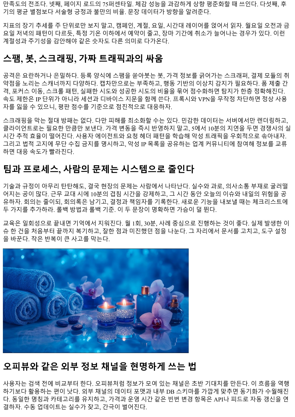만족도의전조다. 넷째, 페이지로드의 75퍼센타일. 체감성능을과감하게상향평준화할때쓰인다. 다섯째, 후 기의평균별점보다서술형긍정과불만의비율. 문장데이터가방향을알려준다. 지표의장기추세를주단위로만보지말고, 캠페인, 계절, 요일, 시간대레이어를얹어서읽자. 월요일오전과금 요일저녁의패턴이다르듯, 특정기온이하에서예약이줄고, 장마기간에취소가늘어나는경우가있다. 이런 계절성과주기성을감안해야같은숫자도다른의미로다가온다. 스팸, 봇, 스크래핑, 가짜트래픽과의싸움 공격은요란하거나은밀하다. 등록양식에스팸을쏟아붓는봇, 가격정보를긁어가는스크래퍼, 결제모듈의취 약점을노리는스캐너까지다양하다. 캡차만으로는부족하고, 행동기반의이상치감지가필요하다. 폼제출간 격, 포커스이동, 스크롤패턴, 실패한시도와성공한시도의비율을묶어점수화하면탐지가한층정확해진다. 속도제한은 IP 단위가아니라세션과디바이스지문을함께쓴다. 프록시와 VPN을무작정차단하면정상사용 자를잃을수있으니, 평판점수를기준으로점진적으로대응하자. 스크래핑을막는절대방패는없다. 다만피해를최소화할수는있다. 민감한데이터는서버에서만렌더링하고, 클라이언트로는필요한만큼만보낸다. 가격변동을즉시반영하지말고, 5에서 10분의지연을두면경쟁사의실 시간추적효율이떨어진다. 사용자에이전트와요청헤더패턴을학습해악성트래픽을우회적으로솎아내자. 그리고법적고지에무단수집금지를명시하고, 악성 IP 목록을공유하는업계커뮤니티에참여해정보를교류 하면대응속도가빨라진다. 팀과프로세스, 사람의문제는시스템으로줄인다 기술과규정이아무리탄탄해도, 결국현장의문제는사람에서나타난다. 실수와과로, 의사소통부재로굴러떨 어지는공이많다. 근무교대시에 10분의겹침시간을강제하고, 그시간동안오늘의이슈와내일의위험을공 유하자. 회의는줄이되, 회의록은남기고, 결정과책임자를기록한다. 새로운기능을내보낼때는체크리스트에 두가지를추가하라. 롤백방법과롤백기준. 이두문장이명확하면가슴이덜뛴다. 교육은일회성으로끝내면기억에서지워진다. 월 1회, 30분, 사례중심으로진행하는것이좋다. 실제발생한이 슈한건을처음부터끝까지복기하고, 잘한점과미진했던점을나눈다. 그자리에서문서를고치고, 도구설정 을바꾼다. 작은반복이큰사고를막는다. 오피뷰와같은외부정보채널을현명하게쓰는법 사용자는검색전에비교부터한다. 오피뷰처럼정보가모여있는채널은초반기대치를만든다. 이흐름을역행 하기보다활용하는편이낫다. 외부채널의데이터포맷과내부 DB 스키마를가깝게맞추면동기화가수월해진 다. 동일한명칭과카테고리를유지하고, 가격과운영시간같은빈번변경항목은 API나피드로자동갱신을연 결하자. 수동업데이트는실수가잦고, 간극이벌어진다.