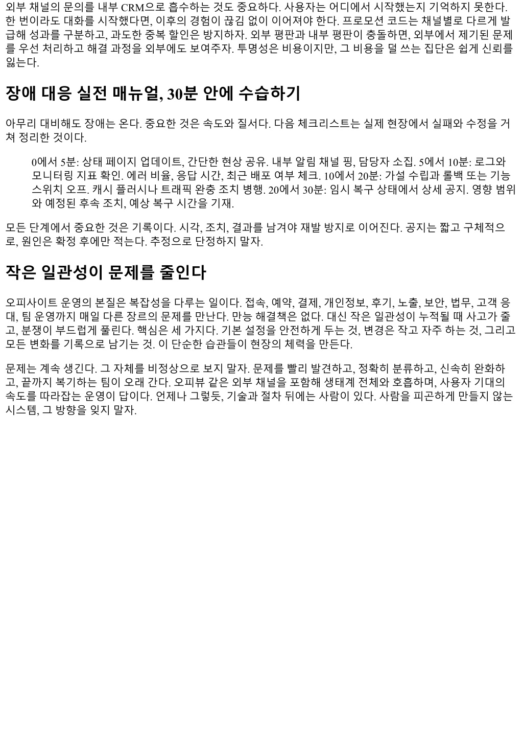 외부채널의문의를내부 CRM으로흡수하는것도중요하다. 사용자는어디에서시작했는지기억하지못한다. 한번이라도대화를시작했다면, 이후의경험이끊김없이이어져야한다. 프로모션코드는채널별로다르게발 급해성과를구분하고, 과도한중복할인은방지하자. 외부평판과내부평판이충돌하면, 외부에서제기된문제 를우선처리하고해결과정을외부에도보여주자. 투명성은비용이지만, 그비용을덜쓰는집단은쉽게신뢰를 잃는다. 장애대응실전매뉴얼, 30분안에수습하기 아무리대비해도장애는온다. 중요한것은속도와질서다. 다음체크리스트는실제현장에서실패와수정을거 쳐정리한것이다. 0에서 5분: 상태페이지업데이트, 간단한현상공유. 내부알림채널핑, 담당자소집. 5에서 10분: 로그와 모니터링지표확인. 에러비율, 응답시간, 최근배포여부체크. 10에서 20분: 가설수립과롤백또는기능 스위치오프. 캐시플러시나트래픽완충조치병행. 20에서 30분: 임시복구상태에서상세공지. 영향범위 와예정된후속조치, 예상복구시간을기재. 모든단계에서중요한것은기록이다. 시각, 조치, 결과를남겨야재발방지로이어진다. 공지는짧고구체적으 로, 원인은확정후에만적는다. 추정으로단정하지말자. 작은일관성이문제를줄인다 오피사이트운영의본질은복잡성을다루는일이다. 접속, 예약, 결제, 개인정보, 후기, 노출, 보안, 법무, 고객응 대, 팀운영까지매일다른장르의문제를만난다. 만능해결책은없다. 대신작은일관성이누적될때사고가줄 고, 분쟁이부드럽게풀린다. 핵심은세가지다. 기본설정을안전하게두는것, 변경은작고자주하는것, 그리고 모든변화를기록으로남기는것. 이단순한습관들이현장의체력을만든다. 문제는계속생긴다. 그자체를비정상으로보지말자. 문제를빨리발견하고, 정확히분류하고, 신속히완화하 고, 끝까지복기하는팀이오래간다. 오피뷰같은외부채널을포함해생태계전체와호흡하며, 사용자기대의 속도를따라잡는운영이답이다. 언제나그렇듯, 기술과절차뒤에는사람이있다. 사람을피곤하게만들지않는 시스템, 그방향을잊지말자.