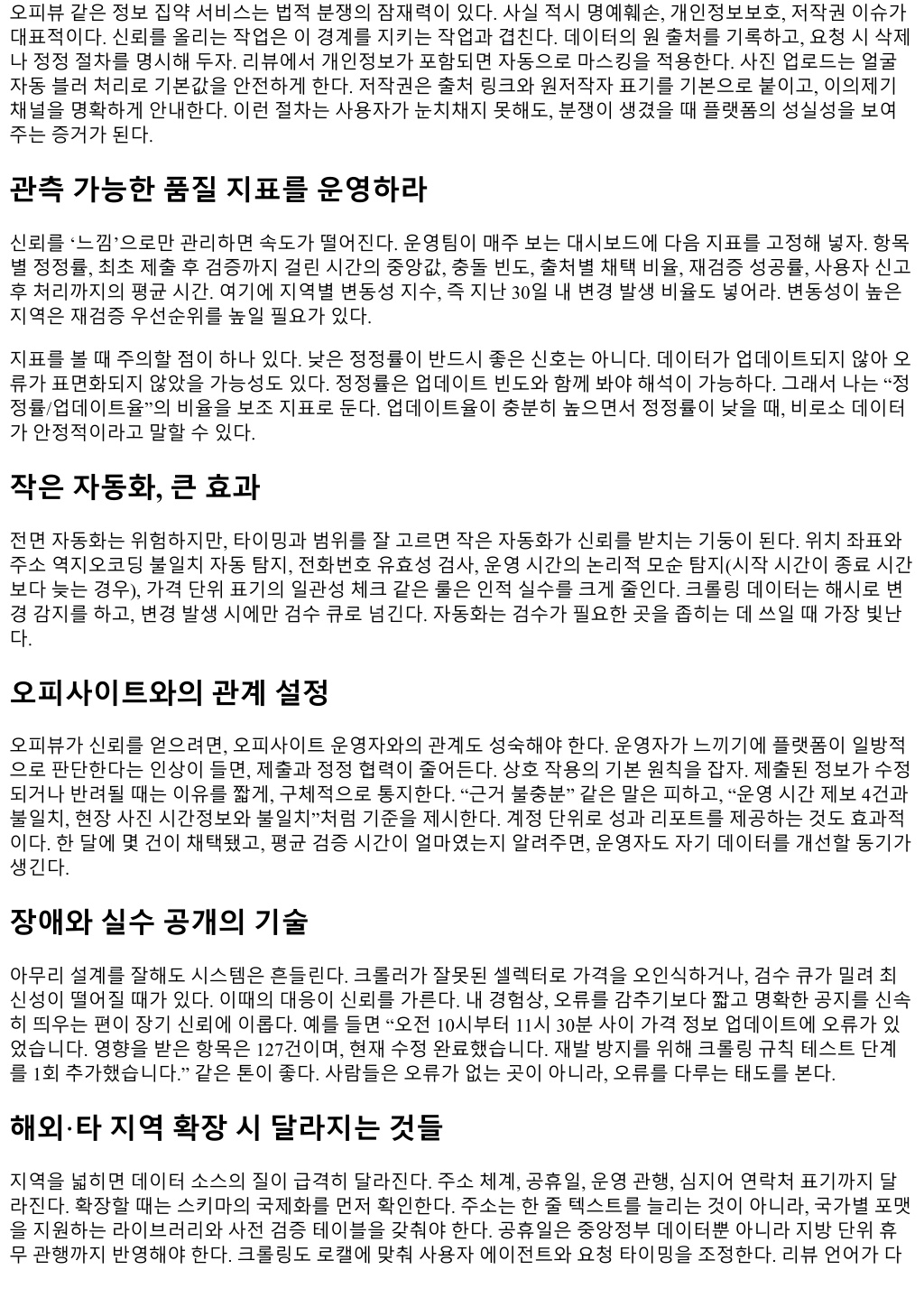 오피뷰같은정보집약서비스는법적분쟁의잠재력이있다. 사실적시명예훼손, 개인정보보호, 저작권이슈가 대표적이다. 신뢰를올리는작업은이경계를지키는작업과겹친다. 데이터의원출처를기록하고, 요청시삭제 나정정절차를명시해두자. 리뷰에서개인정보가포함되면자동으로마스킹을적용한다. 사진업로드는얼굴 자동블러처리로기본값을안전하게한다. 저작권은출처링크와원저작자표기를기본으로붙이고, 이의제기 채널을명확하게안내한다. 이런절차는사용자가눈치채지못해도, 분쟁이생겼을때플랫폼의성실성을보여 주는증거가된다. 관측가능한품질지표를운영하라 신뢰를 ‘느낌’으로만관리하면속도가떨어진다. 운영팀이매주보는대시보드에다음지표를고정해넣자. 항목 별정정률, 최초제출후검증까지걸린시간의중앙값, 충돌빈도, 출처별채택비율, 재검증성공률, 사용자신고 후처리까지의평균시간. 여기에지역별변동성지수, 즉지난 30일내변경발생비율도넣어라. 변동성이높은 지역은재검증우선순위를높일필요가있다. 지표를볼때주의할점이하나있다. 낮은정정률이반드시좋은신호는아니다. 데이터가업데이트되지않아오 류가표면화되지않았을가능성도있다. 정정률은업데이트빈도와함께봐야해석이가능하다. 그래서나는 “정 정률/업데이트율”의비율을보조지표로둔다. 업데이트율이충분히높으면서정정률이낮을때, 비로소데이터 가안정적이라고말할수있다. 작은자동화, 큰효과 전면자동화는위험하지만, 타이밍과범위를잘고르면작은자동화가신뢰를받치는기둥이된다. 위치좌표와 주소역지오코딩불일치자동탐지, 전화번호유효성검사, 운영시간의논리적모순탐지(시작시간이종료시간 보다늦는경우), 가격단위표기의일관성체크같은룰은인적실수를크게줄인다. 크롤링데이터는해시로변 경감지를하고, 변경발생시에만검수큐로넘긴다. 자동화는검수가필요한곳을좁히는데쓰일때가장빛난 다. 오피사이트와의관계설정 오피뷰가신뢰를얻으려면, 오피사이트운영자와의관계도성숙해야한다. 운영자가느끼기에플랫폼이일방적 으로판단한다는인상이들면, 제출과정정협력이줄어든다. 상호작용의기본원칙을잡자. 제출된정보가수정 되거나반려될때는이유를짧게, 구체적으로통지한다. “근거불충분” 같은말은피하고, “운영시간제보 4건과 불일치, 현장사진시간정보와불일치”처럼기준을제시한다. 계정단위로성과리포트를제공하는것도효과적 이다. 한달에몇건이채택됐고, 평균검증시간이얼마였는지알려주면, 운영자도자기데이터를개선할동기가 생긴다. 장애와실수공개의기술 아무리설계를잘해도시스템은흔들린다. 크롤러가잘못된셀렉터로가격을오인식하거나, 검수큐가밀려최 신성이떨어질때가있다. 이때의대응이신뢰를가른다. 내경험상, 오류를감추기보다짧고명확한공지를신속 히띄우는편이장기신뢰에이롭다. 예를들면 “오전 10시부터 11시 30분사이가격정보업데이트에오류가있 었습니다. 영향을받은항목은 127건이며, 현재수정완료했습니다. 재발방지를위해크롤링규칙테스트단계 를 1회추가했습니다.” 같은톤이좋다. 사람들은오류가없는곳이아니라, 오류를다루는태도를본다. 해외·타지역확장시달라지는것들 지역을넓히면데이터소스의질이급격히달라진다. 주소체계, 공휴일, 운영관행, 심지어연락처표기까지달 라진다. 확장할때는스키마의국제화를먼저확인한다. 주소는한줄텍스트를늘리는것이아니라, 국가별포맷 을지원하는라이브러리와사전검증테이블을갖춰야한다. 공휴일은중앙정부데이터뿐아니라지방단위휴 무관행까지반영해야한다. 크롤링도로캘에맞춰사용자에이전트와요청타이밍을조정한다. 리뷰언어가다