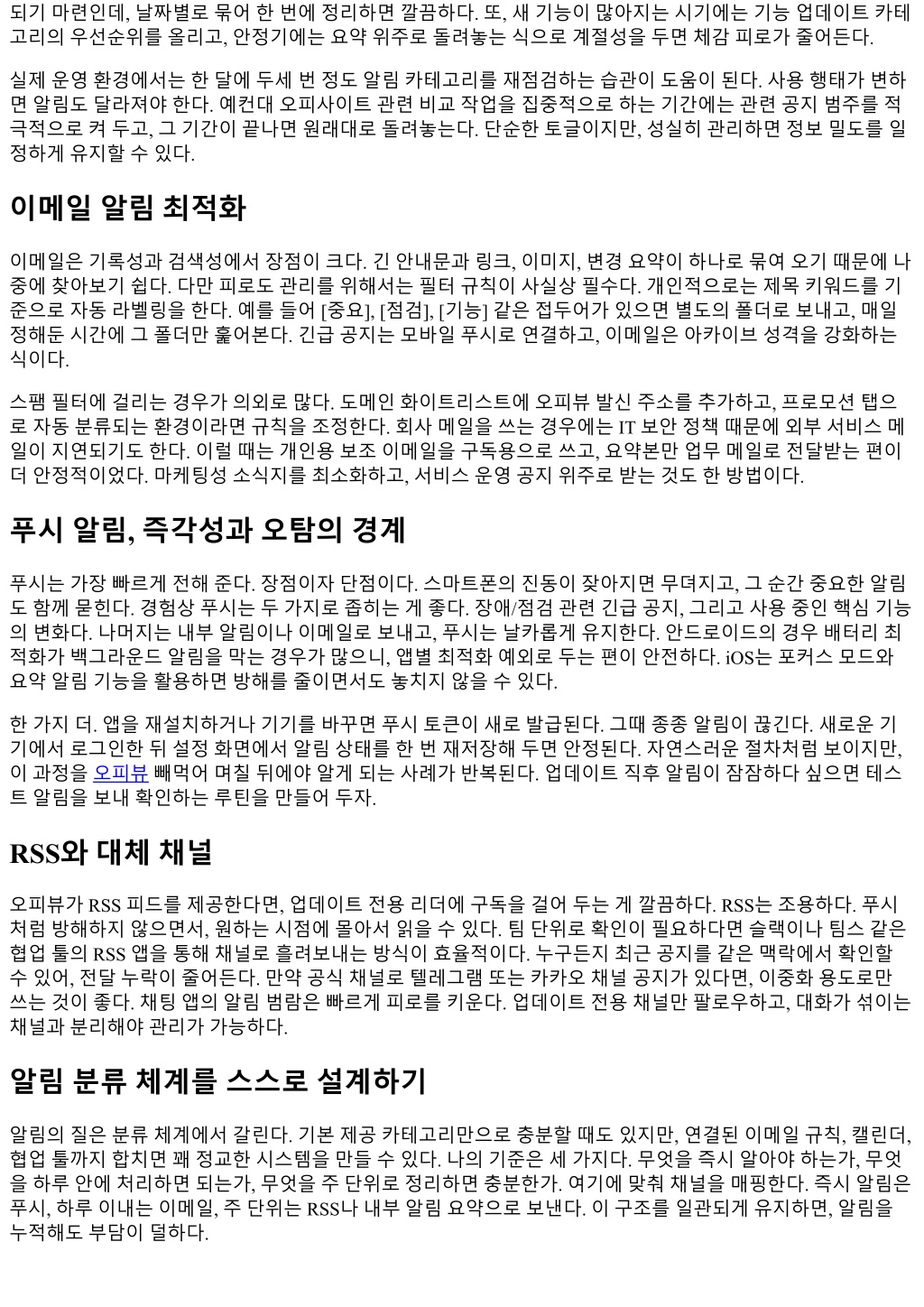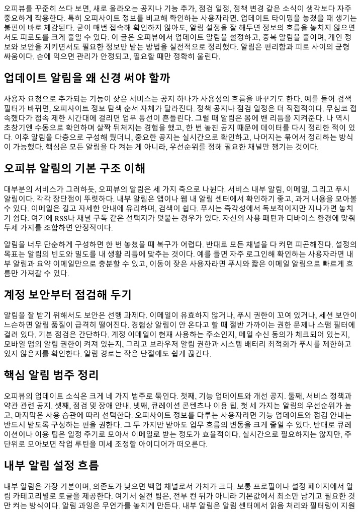 되기마련인데, 날짜별로묶어한번에정리하면깔끔하다. 또, 새기능이많아지는시기에는기능업데이트카테 고리의우선순위를올리고, 안정기에는요약위주로돌려놓는식으로계절성을두면체감피로가줄어든다. 실제운영환경에서는한달에두세번정도알림카테고리를재점검하는습관이도움이된다. 사용행태가변하 면알림도달라져야한다. 예컨대오피사이트관련비교작업을집중적으로하는기간에는관련공지범주를적 극적으로켜두고, 그기간이끝나면원래대로돌려놓는다. 단순한토글이지만, 성실히관리하면정보밀도를일 정하게유지할수있다. 이메일알림최적화 이메일은기록성과검색성에서장점이크다. 긴안내문과링크, 이미지, 변경요약이하나로묶여오기때문에나 중에찾아보기쉽다. 다만피로도관리를위해서는필터규칙이사실상필수다. 개인적으로는제목키워드를기 준으로자동라벨링을한다. 예를들어 [중요], [점검], [기능] 같은접두어가있으면별도의폴더로보내고, 매일 정해둔시간에그폴더만훑어본다. 긴급공지는모바일푸시로연결하고, 이메일은아카이브성격을강화하는 식이다. 스팸필터에걸리는경우가의외로많다. 도메인화이트리스트에오피뷰발신주소를추가하고, 프로모션탭으 로자동분류되는환경이라면규칙을조정한다. 회사메일을쓰는경우에는 IT 보안정책때문에외부서비스메 일이지연되기도한다. 이럴때는개인용보조이메일을구독용으로쓰고, 요약본만업무메일로전달받는편이 더안정적이었다. 마케팅성소식지를최소화하고, 서비스운영공지위주로받는것도한방법이다. 푸시알림, 즉각성과오탐의경계 푸시는가장빠르게전해준다. 장점이자단점이다. 스마트폰의진동이잦아지면무뎌지고, 그순간중요한알림 도함께묻힌다. 경험상푸시는두가지로좁히는게좋다. 장애/점검관련긴급공지, 그리고사용중인핵심기능 의변화다. 나머지는내부알림이나이메일로보내고, 푸시는날카롭게유지한다. 안드로이드의경우배터리최 적화가백그라운드알림을막는경우가많으니, 앱별최적화예외로두는편이안전하다. iOS는포커스모드와 요약알림기능을활용하면방해를줄이면서도놓치지않을수있다. 한가지더. 앱을재설치하거나기기를바꾸면푸시토큰이새로발급된다. 그때종종알림이끊긴다. 새로운기 기에서로그인한뒤설정화면에서알림상태를한번재저장해두면안정된다. 자연스러운절차처럼보이지만, 이과정을오피뷰빼먹어며칠뒤에야알게되는사례가반복된다. 업데이트직후알림이잠잠하다싶으면테스 트알림을보내확인하는루틴을만들어두자. RSS와대체채널 오피뷰가 RSS 피드를제공한다면, 업데이트전용리더에구독을걸어두는게깔끔하다. RSS는조용하다. 푸시 처럼방해하지않으면서, 원하는시점에몰아서읽을수있다. 팀단위로확인이필요하다면슬랙이나팀스같은 협업툴의 RSS 앱을통해채널로흘려보내는방식이효율적이다. 누구든지최근공지를같은맥락에서확인할 수있어, 전달누락이줄어든다. 만약공식채널로텔레그램또는카카오채널공지가있다면, 이중화용도로만 쓰는것이좋다. 채팅앱의알림범람은빠르게피로를키운다. 업데이트전용채널만팔로우하고, 대화가섞이는 채널과분리해야관리가가능하다. 알림분류체계를스스로설계하기 알림의질은분류체계에서갈린다. 기본제공카테고리만으로충분할때도있지만, 연결된이메일규칙, 캘린더, 협업툴까지합치면꽤정교한시스템을만들수있다. 나의기준은세가지다. 무엇을즉시알아야하는가, 무엇 을하루안에처리하면되는가, 무엇을주단위로정리하면충분한가. 여기에맞춰채널을매핑한다. 즉시알림은 푸시, 하루이내는이메일, 주단위는 RSS나내부알림요약으로보낸다. 이구조를일관되게유지하면, 알림을 누적해도부담이덜하다.