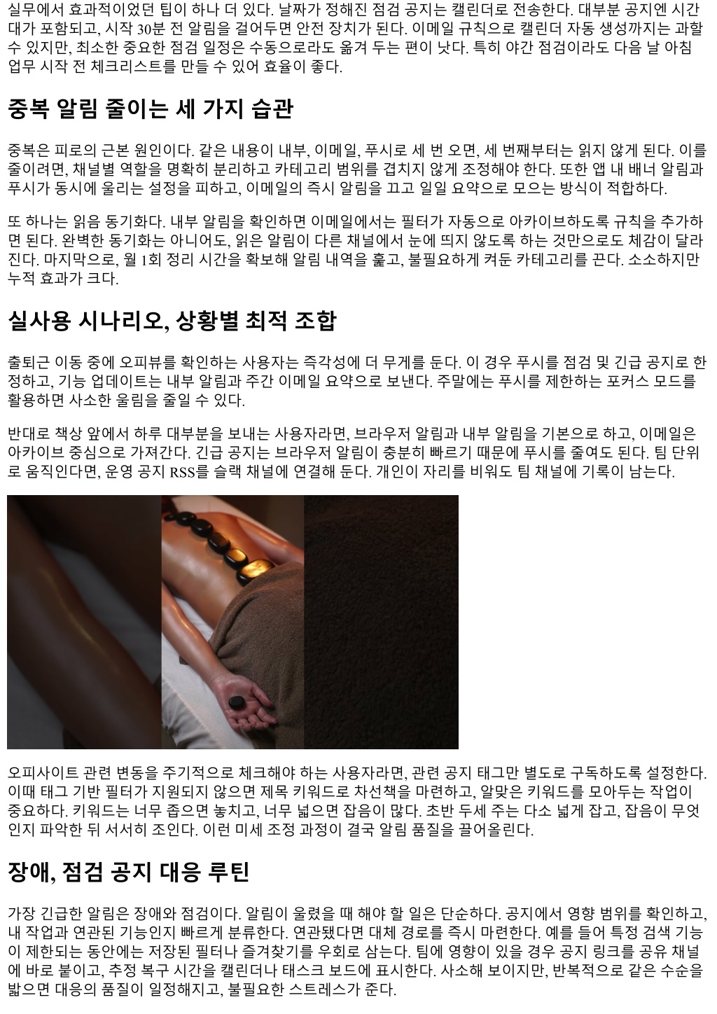 실무에서효과적이었던팁이하나더있다. 날짜가정해진점검공지는캘린더로전송한다. 대부분공지엔시간 대가포함되고, 시작 30분전알림을걸어두면안전장치가된다. 이메일규칙으로캘린더자동생성까지는과할 수있지만, 최소한중요한점검일정은수동으로라도옮겨두는편이낫다. 특히야간점검이라도다음날아침 업무시작전체크리스트를만들수있어효율이좋다. 중복알림줄이는세가지습관 중복은피로의근본원인이다. 같은내용이내부, 이메일, 푸시로세번오면, 세번째부터는읽지않게된다. 이를 줄이려면, 채널별역할을명확히분리하고카테고리범위를겹치지않게조정해야한다. 또한앱내배너알림과 푸시가동시에울리는설정을피하고, 이메일의즉시알림을끄고일일요약으로모으는방식이적합하다. 또하나는읽음동기화다. 내부알림을확인하면이메일에서는필터가자동으로아카이브하도록규칙을추가하 면된다. 완벽한동기화는아니어도, 읽은알림이다른채널에서눈에띄지않도록하는것만으로도체감이달라 진다. 마지막으로, 월 1회정리시간을확보해알림내역을훑고, 불필요하게켜둔카테고리를끈다. 소소하지만 누적효과가크다. 실사용시나리오, 상황별최적조합 출퇴근이동중에오피뷰를확인하는사용자는즉각성에더무게를둔다. 이경우푸시를점검및긴급공지로한 정하고, 기능업데이트는내부알림과주간이메일요약으로보낸다. 주말에는푸시를제한하는포커스모드를 활용하면사소한울림을줄일수있다. 반대로책상앞에서하루대부분을보내는사용자라면, 브라우저알림과내부알림을기본으로하고, 이메일은 아카이브중심으로가져간다. 긴급공지는브라우저알림이충분히빠르기때문에푸시를줄여도된다. 팀단위 로움직인다면, 운영공지 RSS를슬랙채널에연결해둔다. 개인이자리를비워도팀채널에기록이남는다. 오피사이트관련변동을주기적으로체크해야하는사용자라면, 관련공지태그만별도로구독하도록설정한다. 이때태그기반필터가지원되지않으면제목키워드로차선책을마련하고, 알맞은키워드를모아두는작업이 중요하다. 키워드는너무좁으면놓치고, 너무넓으면잡음이많다. 초반두세주는다소넓게잡고, 잡음이무엇 인지파악한뒤서서히조인다. 이런미세조정과정이결국알림품질을끌어올린다. 장애, 점검공지대응루틴 가장긴급한알림은장애와점검이다. 알림이울렸을때해야할일은단순하다. 공지에서영향범위를확인하고, 내작업과연관된기능인지빠르게분류한다. 연관됐다면대체경로를즉시마련한다. 예를들어특정검색기능 이제한되는동안에는저장된필터나즐겨찾기를우회로삼는다. 팀에영향이있을경우공지링크를공유채널 에바로붙이고, 추정복구시간을캘린더나태스크보드에표시한다. 사소해보이지만, 반복적으로같은수순을 밟으면대응의품질이일정해지고, 불필요한스트레스가준다.