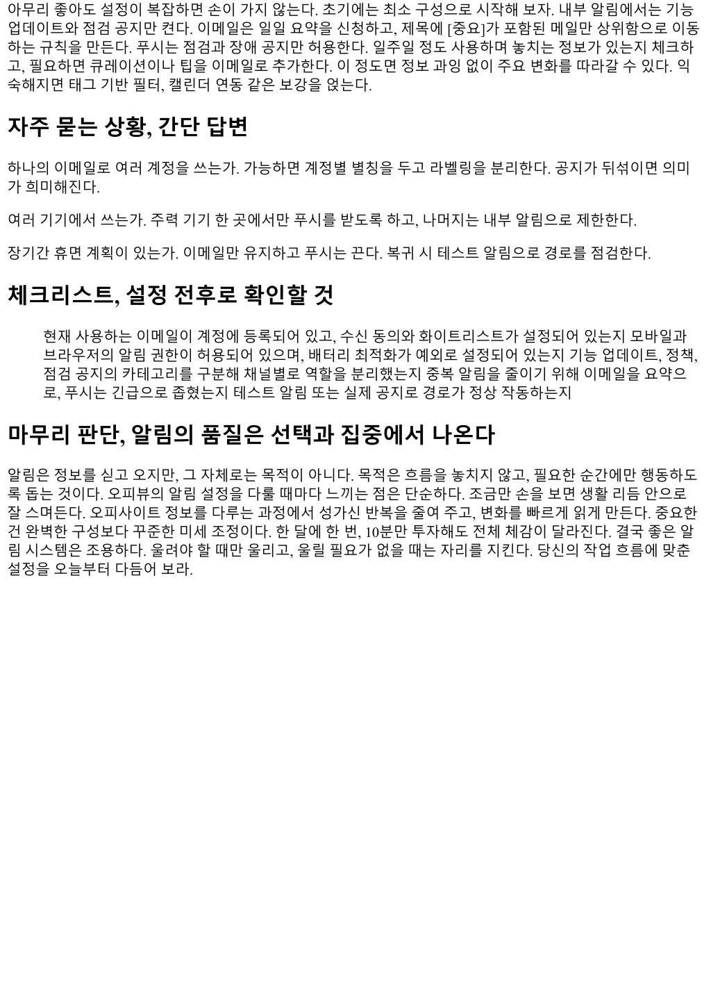 아무리좋아도설정이복잡하면손이가지않는다. 초기에는최소구성으로시작해보자. 내부알림에서는기능 업데이트와점검공지만켠다. 이메일은일일요약을신청하고, 제목에 [중요]가포함된메일만상위함으로이동 하는규칙을만든다. 푸시는점검과장애공지만허용한다. 일주일정도사용하며놓치는정보가있는지체크하 고, 필요하면큐레이션이나팁을이메일로추가한다. 이정도면정보과잉없이주요변화를따라갈수있다. 익 숙해지면태그기반필터, 캘린더연동같은보강을얹는다. 자주묻는상황, 간단답변 하나의이메일로여러계정을쓰는가. 가능하면계정별별칭을두고라벨링을분리한다. 공지가뒤섞이면의미 가희미해진다. 여러기기에서쓰는가. 주력기기한곳에서만푸시를받도록하고, 나머지는내부알림으로제한한다. 장기간휴면계획이있는가. 이메일만유지하고푸시는끈다. 복귀시테스트알림으로경로를점검한다. 체크리스트, 설정전후로확인할것 현재사용하는이메일이계정에등록되어있고, 수신동의와화이트리스트가설정되어있는지모바일과 브라우저의알림권한이허용되어있으며, 배터리최적화가예외로설정되어있는지기능업데이트, 정책, 점검공지의카테고리를구분해채널별로역할을분리했는지중복알림을줄이기위해이메일을요약으 로, 푸시는긴급으로좁혔는지테스트알림또는실제공지로경로가정상작동하는지 마무리판단, 알림의품질은선택과집중에서나온다 알림은정보를싣고오지만, 그자체로는목적이아니다. 목적은흐름을놓치지않고, 필요한순간에만행동하도 록돕는것이다. 오피뷰의알림설정을다룰때마다느끼는점은단순하다. 조금만손을보면생활리듬안으로 잘스며든다. 오피사이트정보를다루는과정에서성가신반복을줄여주고, 변화를빠르게읽게만든다. 중요한 건완벽한구성보다꾸준한미세조정이다. 한달에한번, 10분만투자해도전체체감이달라진다. 결국좋은알 림시스템은조용하다. 울려야할때만울리고, 울릴필요가없을때는자리를지킨다. 당신의작업흐름에맞춘 설정을오늘부터다듬어보라.