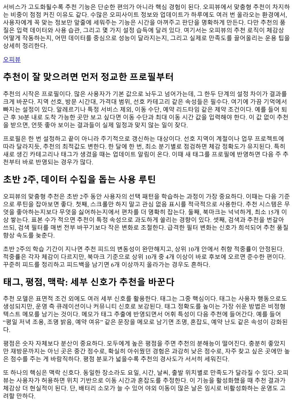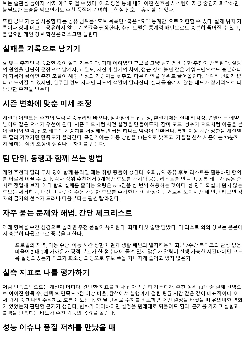 보는습관을들이자. 삭제예약도걸수있다. 이과정을통해내가어떤신호를시스템에제공중인지파악하면, 불필요한노출을막으면서도추천품질에기여하는핵심신호는유지할수있다. 또한공유기능을사용할때는공유범위를 “후보목록만” 혹은 “요약통계만”으로제한할수있다. 실제위치기 록이나상세메모는공유하지않는기본값을권장한다. 추천모델은통계적패턴으로도충분히좋아질수있고, 불필요한개인정보확산은리스크만늘린다. 실패를기록으로남기기 잘맞는추천만큼중요한것이실패기록이다. 기대이하였던후보를그냥넘기면비슷한추천이반복된다. 실망 의원인을간단히문장으로남기자. 과밀도, 사진과실제의차이, 접근경로불편같은키워드만으로도충분하다. 이기록이쌓이면추천모델이해당속성의가중치를낮추고, 다른대안을상위로끌어올린다. 즉각적변화가없 다고느껴질수있지만, 일주일정도지나면피드의색깔이달라진다. 실패를숨기지않는태도가장기적으로더 탄탄한추천을만든다. 시즌변화에맞춘미세조정 계절과이벤트는추천의맥락을송두리째바꾼다. 장마철에는접근성, 환절기에는실내쾌적성, 연말에는예약 난이도같은요소가우선이된다. 시즌카드처럼사전설정을만들어두자. 장마모드, 성수기모드처럼이름을붙 여필터와알림, 선호태그의가중치를저장해두면버튼하나로맥락이전환된다. 특히이동시간상한을계절별 로달리가져가면만족도가올라간다. 폭염기에는이동상한을 15분으로낮추고, 가을철산책시즌에는 30분까 지넓히는식의조정이실감나는차이를만든다. 팀단위, 동행과함께쓰는방법 개인추천과달리두세명이함께움직일때는취향충돌이생긴다. 오피뷰의공유후보리스트를활용하면합의 를빠르게이끌수있다. 각자상위추천에서 3개씩만후보를가져와공동리스트를만들고, 공통태그가많은순 서로정렬해보자. 이때합의실패를줄이는요령은 veto권을한번씩허용하는것이다. 한명이확실히원치않는 후보는제거하고, 대신그사람이수용가능한후보를추가한다. 이과정이번거로워보이지만세번만해보면각 자의금기와선호가드러나다음부터는훨씬빨라진다. 자주묻는문제와해법, 간단체크리스트 아래항목을주간점검으로돌리면추천품질이유지된다. 최대다섯줄만담았다. 이리스트외의정보는본문에 서충분히다뤘으므로중복을피한다. 프로필의지역, 이동수단, 이동시간상한이현재생활패턴과일치하는가최근 2주간북마크와관심없음 비율이 2 대 1에가까운가평점분포가한점수대에몰려있지않은가알림이실행가능한시간대에만오도 록설정되었는가태그가희소성과잉으로후보폭을지나치게줄이고있지않은가 실측지표로나를평가하기 체감만족도만으로는개선이더디다. 간단한지표를하나잡아꾸준히기록하자. 추천상위 10개중실제선택으 로이어진항목수, 선택후만족도 7점이상비율, 탐색에서실행까지걸린평균시간같은값이대표적이다. 이 세가지중하나만추적해도흐름이보인다. 한달단위로수치를비교하면어떤설정을바꿨을때유의미한변화 가있었는지판단할근거가생긴다. 변화가미미하다면설정을원래대로되돌려도된다. 끈기를가지고실험과 롤백을반복하는태도가추천기능의몸값을올린다. 성능이슈나품질저하를만났을때