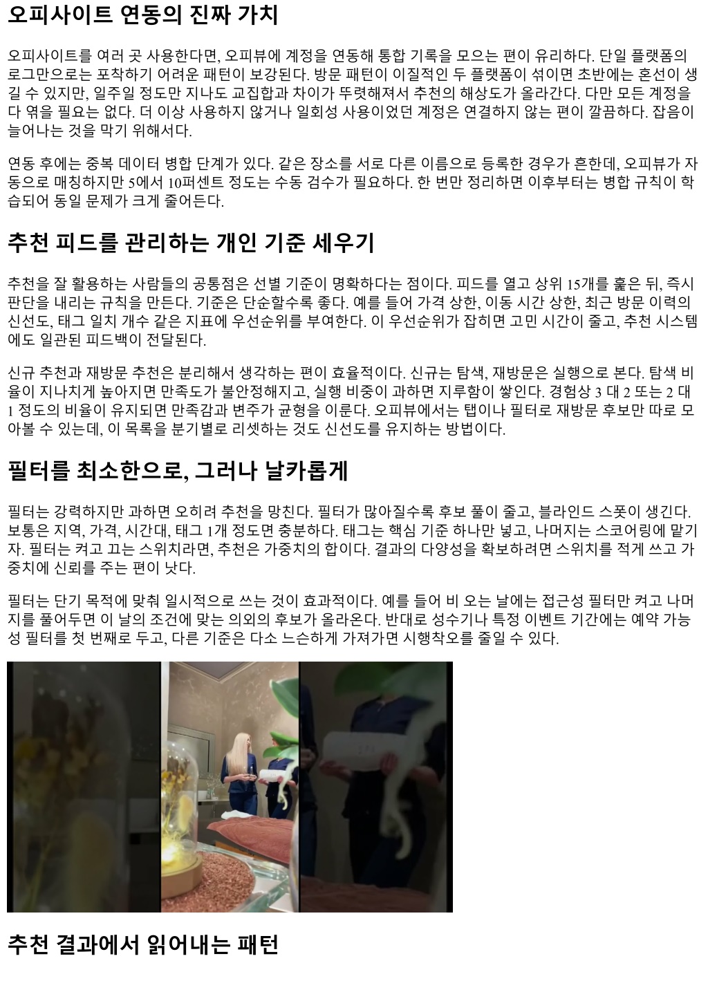 오피사이트연동의진짜가치 오피사이트를여러곳사용한다면, 오피뷰에계정을연동해통합기록을모으는편이유리하다. 단일플랫폼의 로그만으로는포착하기어려운패턴이보강된다. 방문패턴이이질적인두플랫폼이섞이면초반에는혼선이생 길수있지만, 일주일정도만지나도교집합과차이가뚜렷해져서추천의해상도가올라간다. 다만모든계정을 다엮을필요는없다. 더이상사용하지않거나일회성사용이었던계정은연결하지않는편이깔끔하다. 잡음이 늘어나는것을막기위해서다. 연동후에는중복데이터병합단계가있다. 같은장소를서로다른이름으로등록한경우가흔한데, 오피뷰가자 동으로매칭하지만 5에서 10퍼센트정도는수동검수가필요하다. 한번만정리하면이후부터는병합규칙이학 습되어동일문제가크게줄어든다. 추천피드를관리하는개인기준세우기 추천을잘활용하는사람들의공통점은선별기준이명확하다는점이다. 피드를열고상위 15개를훑은뒤, 즉시 판단을내리는규칙을만든다. 기준은단순할수록좋다. 예를들어가격상한, 이동시간상한, 최근방문이력의 신선도, 태그일치개수같은지표에우선순위를부여한다. 이우선순위가잡히면고민시간이줄고, 추천시스템 에도일관된피드백이전달된다. 신규추천과재방문추천은분리해서생각하는편이효율적이다. 신규는탐색, 재방문은실행으로본다. 탐색비 율이지나치게높아지면만족도가불안정해지고, 실행비중이과하면지루함이쌓인다. 경험상 3 대 2 또는 2 대 1 정도의비율이유지되면만족감과변주가균형을이룬다. 오피뷰에서는탭이나필터로재방문후보만따로모 아볼수있는데, 이목록을분기별로리셋하는것도신선도를유지하는방법이다. 필터를최소한으로, 그러나날카롭게 필터는강력하지만과하면오히려추천을망친다. 필터가많아질수록후보풀이줄고, 블라인드스폿이생긴다. 보통은지역, 가격, 시간대, 태그 1개정도면충분하다. 태그는핵심기준하나만넣고, 나머지는스코어링에맡기 자. 필터는켜고끄는스위치라면, 추천은가중치의합이다. 결과의다양성을확보하려면스위치를적게쓰고가 중치에신뢰를주는편이낫다. 필터는단기목적에맞춰일시적으로쓰는것이효과적이다. 예를들어비오는날에는접근성필터만켜고나머 지를풀어두면이날의조건에맞는의외의후보가올라온다. 반대로성수기나특정이벤트기간에는예약가능 성필터를첫번째로두고, 다른기준은다소느슨하게가져가면시행착오를줄일수있다. 추천결과에서읽어내는패턴
