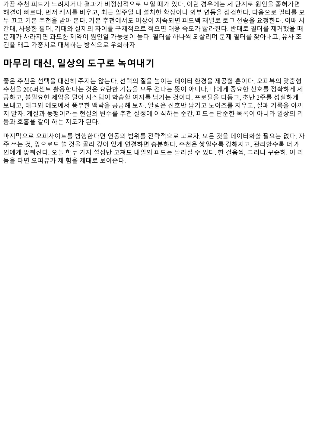 가끔추천피드가느려지거나결과가비정상적으로보일때가있다. 이런경우에는세단계로원인을좁혀가면 해결이빠르다. 먼저캐시를비우고, 최근일주일내설치한확장이나외부연동을점검한다. 다음으로필터를모 두끄고기본추천을받아본다. 기본추천에서도이상이지속되면피드백채널로로그전송을요청한다. 이때시 간대, 사용한필터, 기대와실제의차이를구체적으로적으면대응속도가빨라진다. 반대로필터를제거했을때 문제가사라지면과도한제약이원인일가능성이높다. 필터를하나씩되살리며문제필터를찾아내고, 유사조 건을태그가중치로대체하는방식으로우회하자. 마무리대신, 일상의도구로녹여내기 좋은추천은선택을대신해주지는않는다. 선택의질을높이는데이터환경을제공할뿐이다. 오피뷰의맞춤형 추천을 200퍼센트활용한다는것은요란한기능을모두켠다는뜻이아니다. 나에게중요한신호를정확하게제 공하고, 불필요한제약을덜어시스템이학습할여지를남기는것이다. 프로필을다듬고, 초반 2주를성실하게 보내고, 태그와메모에서풍부한맥락을공급해보자. 알림은신호만남기고노이즈를지우고, 실패기록을아끼 지말자. 계절과동행이라는현실의변수를추천설정에이식하는순간, 피드는단순한목록이아니라일상의리 듬과호흡을같이하는지도가된다. 마지막으로오피사이트를병행한다면연동의범위를전략적으로고르자. 모든것을데이터화할필요는없다. 자 주쓰는것, 앞으로도쓸것을골라깊이있게연결하면충분하다. 추천은쌓일수록강해지고, 관리할수록더개 인에게맞춰진다. 오늘한두가지설정만고쳐도내일의피드는달라질수있다. 한걸음씩, 그러나꾸준히. 이리 듬을타면오피뷰가제힘을제대로보여준다.