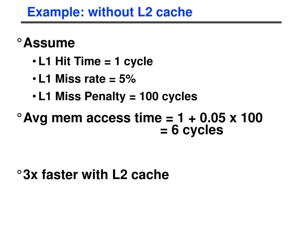 Example: without L2 cache • Assume • L1 Hit Time = 1 cycle • L1 Miss rate = 5% • L1 Miss Penalty = 100 cycles • Avg mem access time = 1 + 0.05 x 100 = 6 cycles • 3x faster with L2 cache