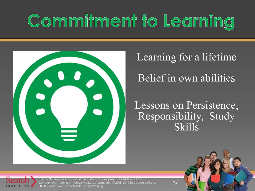 Commitment to Learning Learning for a lifetime Belief in own abilities Lessons on Persistence, Responsibility, Study Skills