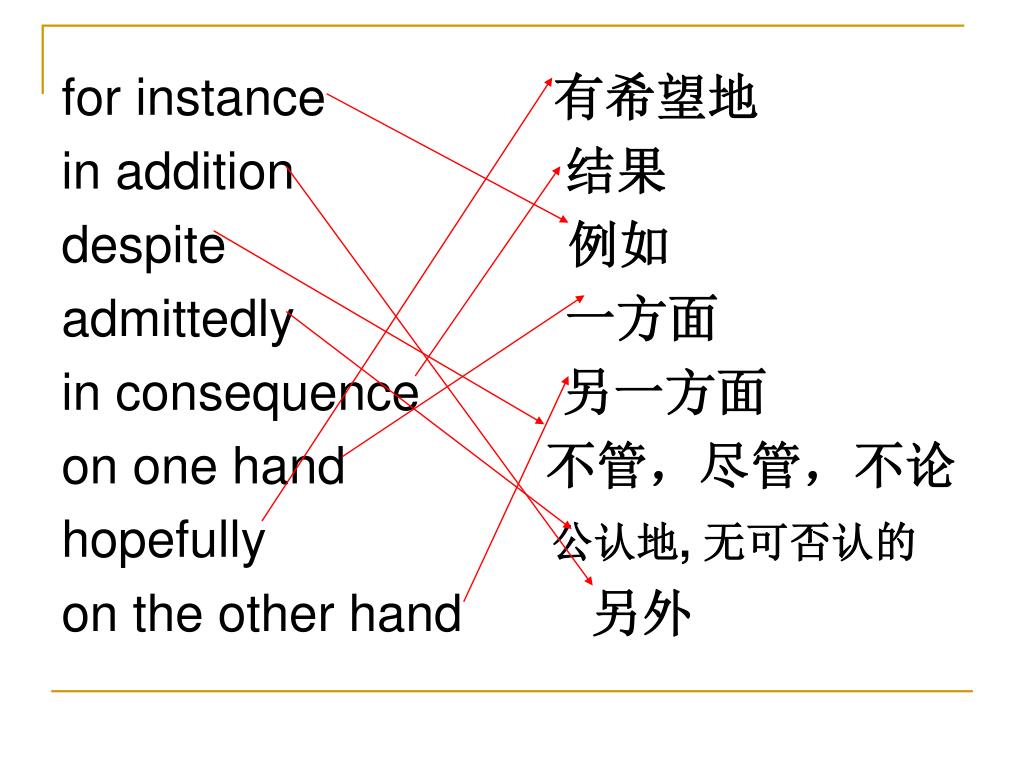 for instance 有希望地 in addition 结果 despite 例如 admittedly 一方面 in consequence 另一方面 on one hand 不管,尽管,不论 hopefully 公认地, 无可否认的 on the other hand 另外