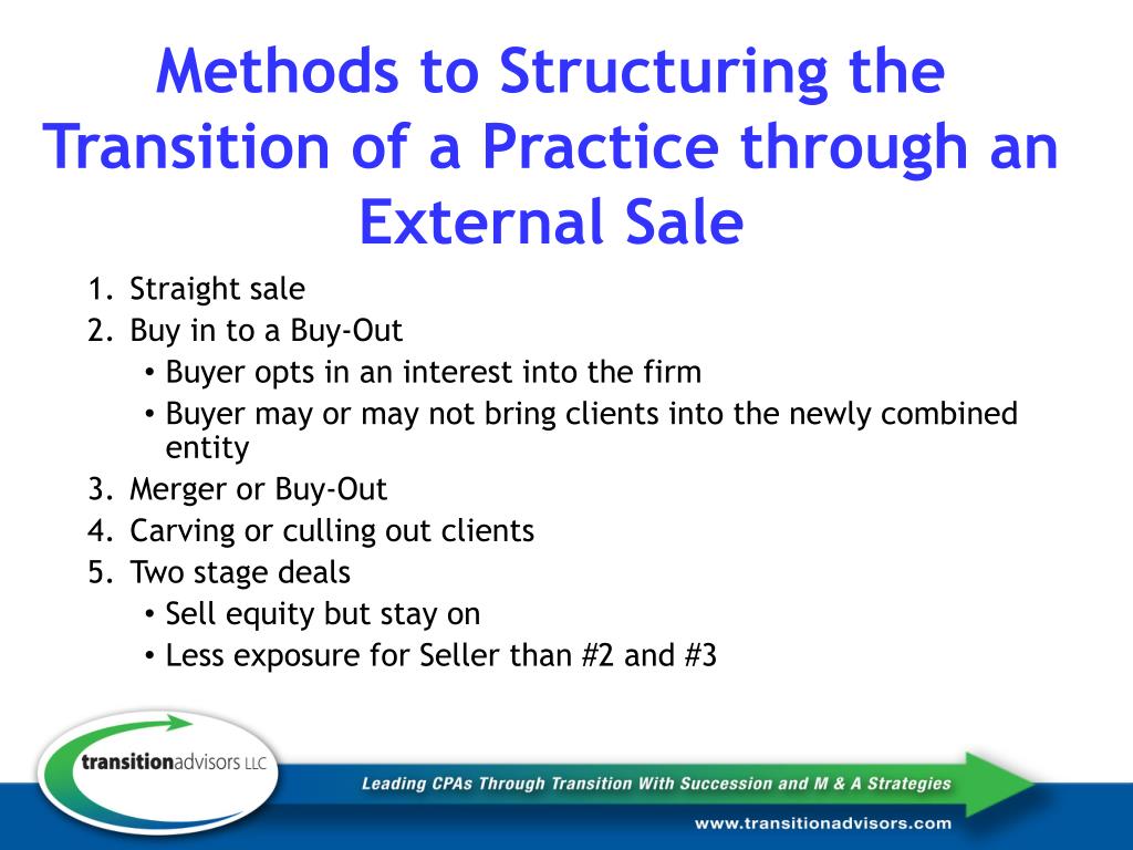 Methods to Structuring the Transition of a Practice through an External Sale Straight sale Buy in to a Buy-Out Buyer opts in an interest into the firm Buyer may or may not bring clients into the newly combined entity Merger or Buy-Out Carving or culling out clients Two stage deals Sell equity but stay on Less exposure for Seller than #2 and #3