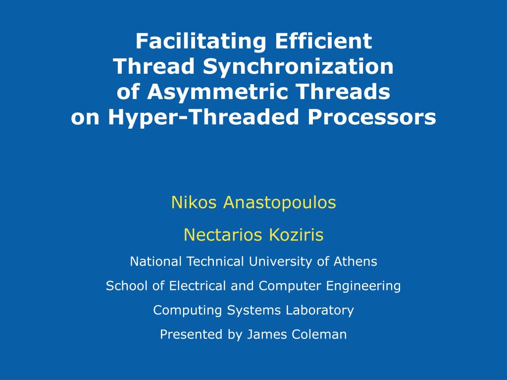 Facilitating Efficient Thread Synchronization of Asymmetric Threads on Hyper-Threaded Processors Nikos Anastopoulos Nectarios Koziris National Technical University of Athens School of Electrical and Computer Engineering Computing Systems Laboratory Presented by James Coleman