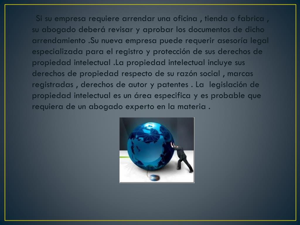 Si su empresa requiere arrendar una oficina , tienda o fabrica , su abogado deberá revisar y aprobar los documentos de dicho arrendamiento .Su nueva empresa puede requerir asesoría legal especializada para el registro y protección de sus derechos de propiedad intelectual .La propiedad intelectual incluye sus derechos de propiedad respecto de su razón social , marcas registradas , derechos de autor y patentes . La legislación de propiedad intelectual es un área especifica y es probable que requiera de un abogado experto en la materia .