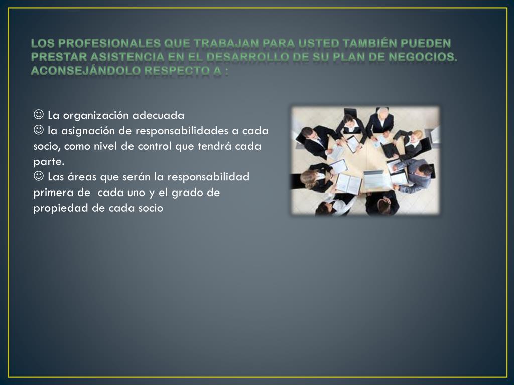 Los profesionales que trabajan para usted también pueden prestar asistencia en el desarrollo de su plan de negocios. Aconsejándolo respecto a : • La organización adecuada • la asignación de responsabilidades a cada socio, como nivel de control que tendrá cada parte. • Las áreas que serán la responsabilidad primera de cada uno y el grado de propiedad de cada socio