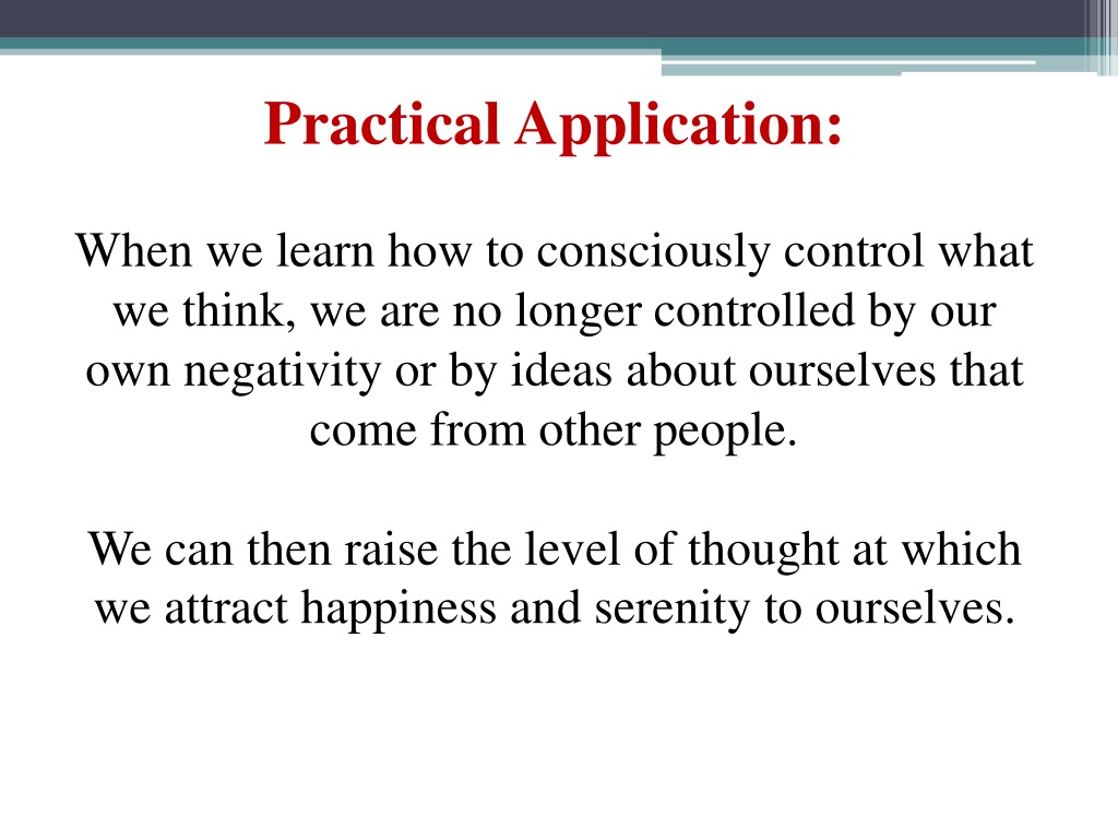 Practical Application: When we learn how to consciously control what we think, we are no longer controlled by our own negativity or by ideas about ourselves that come from other people. We can then raise the level of thought at which we attract happiness and serenity to ourselves.