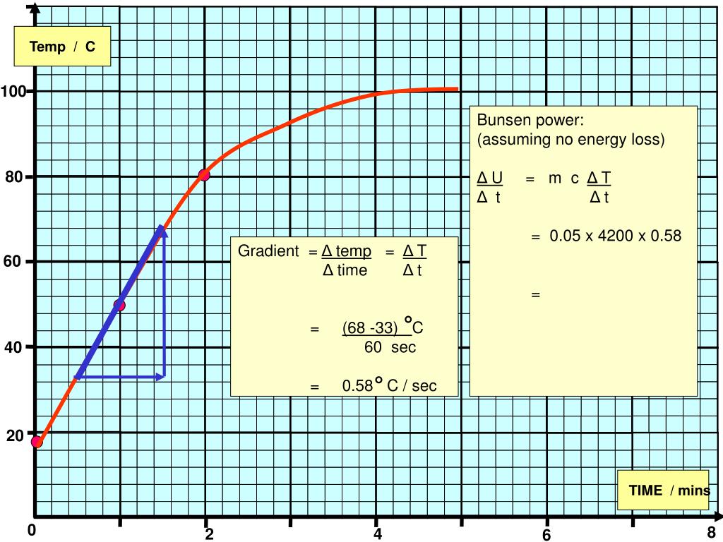 Temp / C 100 Bunsen power: (assuming no energy loss) Δ U = m c Δ T Δ t Δ t = 80 Gradient = Δ temp = Δ T Δ time Δ t = (68 -33) C 60 sec = 0.58 C / sec 60 40 20 TIME / mins 0 8 4 2 6