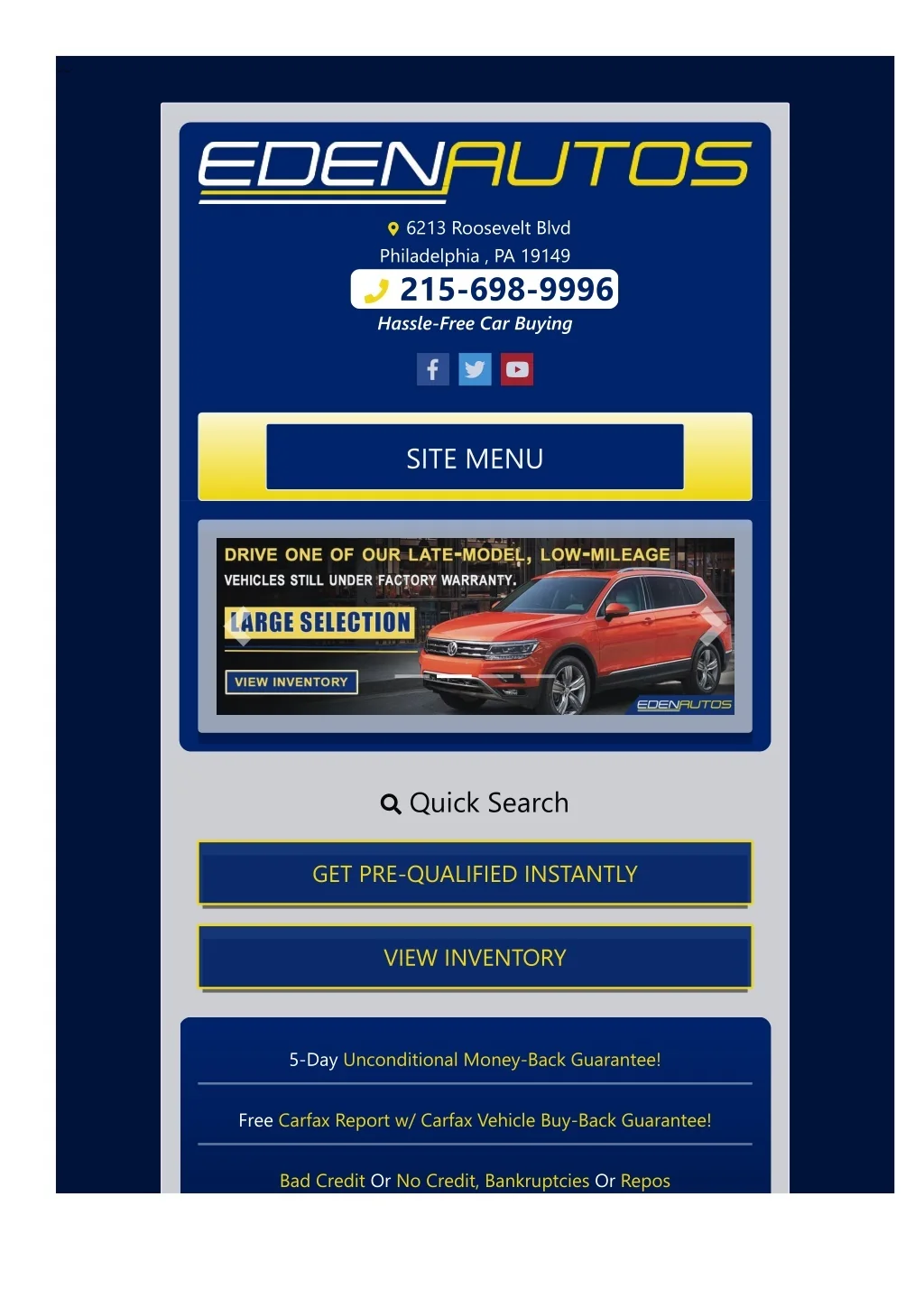 understand that buying a car is a big purchase and we want to give you the option to check it out. There are many things to consider when buying a used car in Philadelphia and Eden Autos wants you to be wise and confident in your purchasing decisions. Define what you need, do your research, budget, run a Carfax report, do a test drive and get the car inspected. This is just a few of many things to consider before buying a car but we wanted to give you a head start. Furthermore…are you interested in making extra money? Check out our cool referral program Referral Program ﴾edenautos.com﴿ where you can earn money just by referring us to your friends and family. Who doesn’t like earning easy money? Give us a call today at 215‐698‐9996 and our customer service staff will be more than happy to help you on your buying journey. Home | About Us | Contact Us | Privacy Policy Dealer Car Search Login | Copyright 2021 | Sitemap Eden Autos 6213 Roosevelt Blvd, Philadelphia , PA 19149 215‐698‐9996