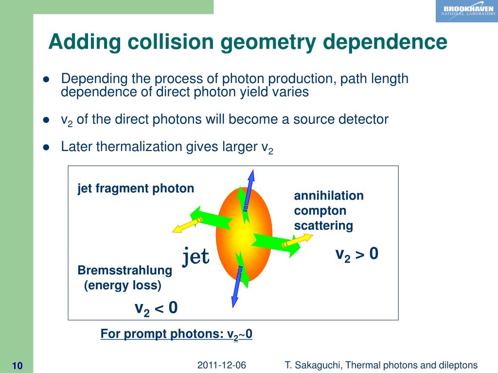 Adding collision geometry dependence Depending the process of photon production, path length dependence of direct photon yield varies v2 of the direct photons will become a source detector Later thermalization gives larger v2 jet fragment photon annihilation compton scattering jet v2 > 0 Bremsstrahlung (energy loss) v2 < 0 For prompt photons: v2~0 T. Sakaguchi, Thermal photons and dileptons