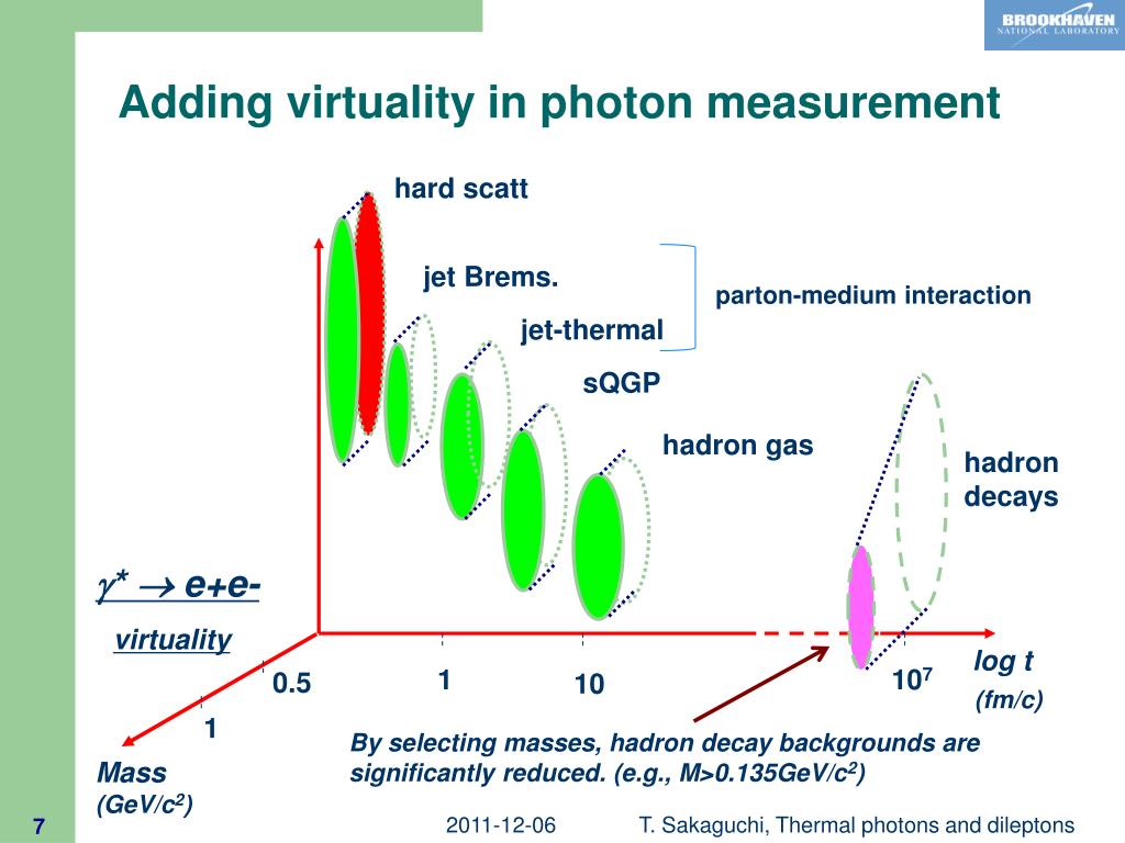 Adding virtuality in photon measurement hard scatt jet Brems. parton-medium interaction jet-thermal sQGP hadron gas hadron decays g* e+e- virtuality log t 1 107 0.5 10 (fm/c) 1 By selecting masses, hadron decay backgrounds are significantly reduced. (e.g., M>0.135GeV/c2) Mass (GeV/c2) T. Sakaguchi, Thermal photons and dileptons