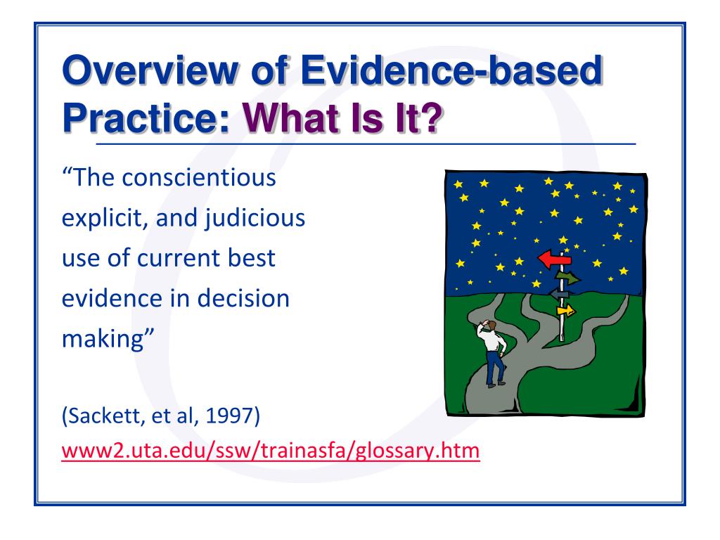 Overview of Evidence-basedPractice: What Is It? “The conscientious explicit, and judicious use of current best evidence in decision making” (Sackett, et al, 1997) www2.uta.edu/ssw/trainasfa/glossary.htm