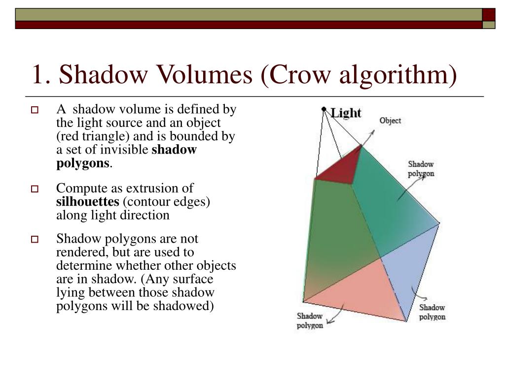 1. Shadow Volumes (Crow algorithm) • A shadow volume is defined by the light source and an object (red triangle) and is bounded by a set of invisible shadow polygons. • Compute as extrusion of silhouettes (contour edges) along light direction • Shadow polygons are not rendered, but are used to determine whether other objects are in shadow.(Any surface lying between those shadow polygons will be shadowed)