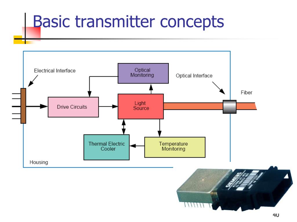What are transmitters and receivers? • Transmitter: A device that includes a source and driving electronics. It functions as an electrical-to-optical converter • Receiver: A terminal device that includes a detector and signal processing electronics. It functions as an optical-to-electrical converter