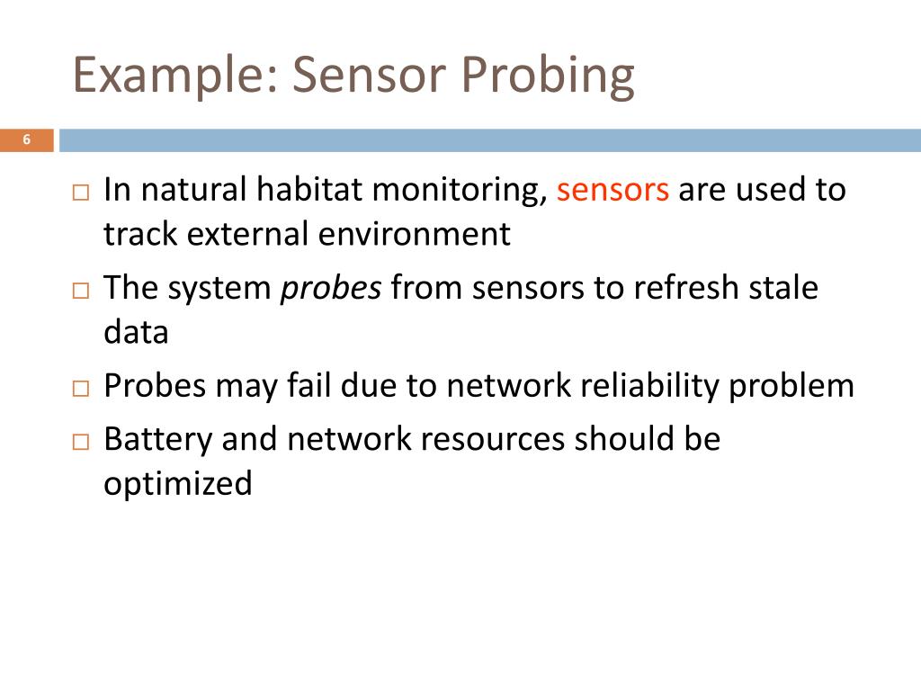 Example: Sensor Probing • In natural habitat monitoring, sensors are used to track external environment • The system probes from sensors to refresh stale data • Probes may fail due to network reliability problem • Battery and network resources should be optimized