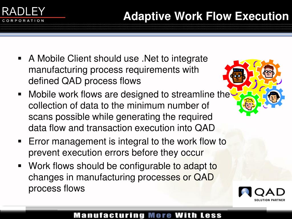 Adaptive Work Flow Execution A Mobile Client should use .Net to integrate manufacturing process requirements with defined QAD process flows Mobile work flows are designed to streamline the collection of data to the minimum number of scans possible while generating the required data flow and transaction execution into QAD Error management is integral to the work flow to prevent execution errors before they occur Work flows should be configurable to adapt to changes in manufacturing processes or QAD process flows