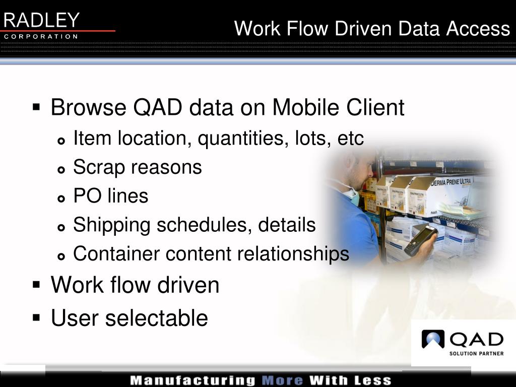 Work Flow Driven Data Access Browse QAD data on Mobile Client Item location, quantities, lots, etc Scrap reasons PO lines Shipping schedules, details Container content relationships Work flow driven User selectable