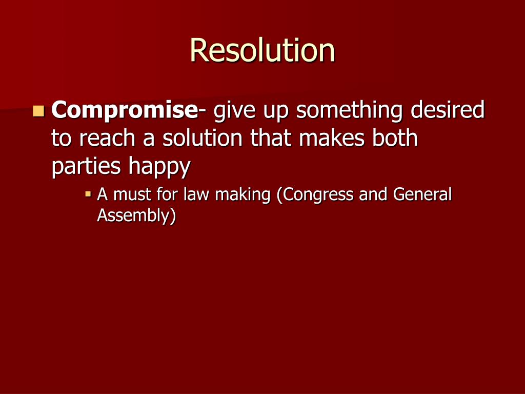 Resolution • Compromise- give up something desired to reach a solution that makes both parties happy • A must for law making (Congress and General Assembly)