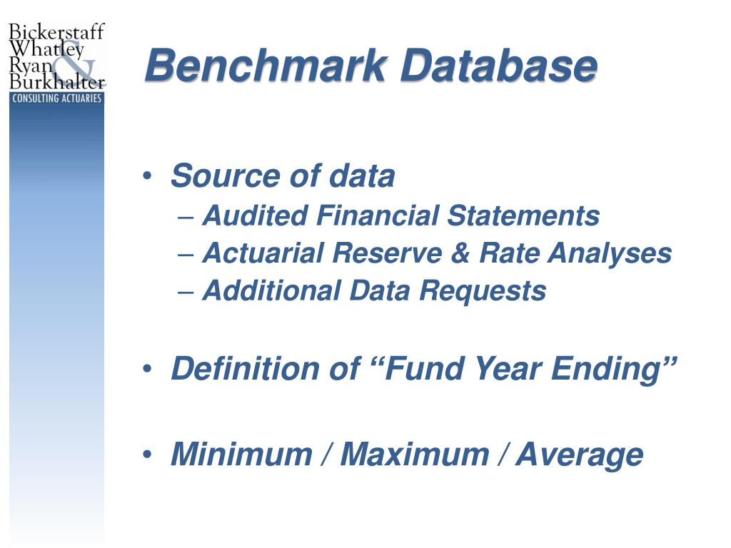 Benchmark Database • Source of data • Audited Financial Statements • Actuarial Reserve & Rate Analyses • Additional Data Requests • Definition of “Fund Year Ending” • Minimum / Maximum / Average