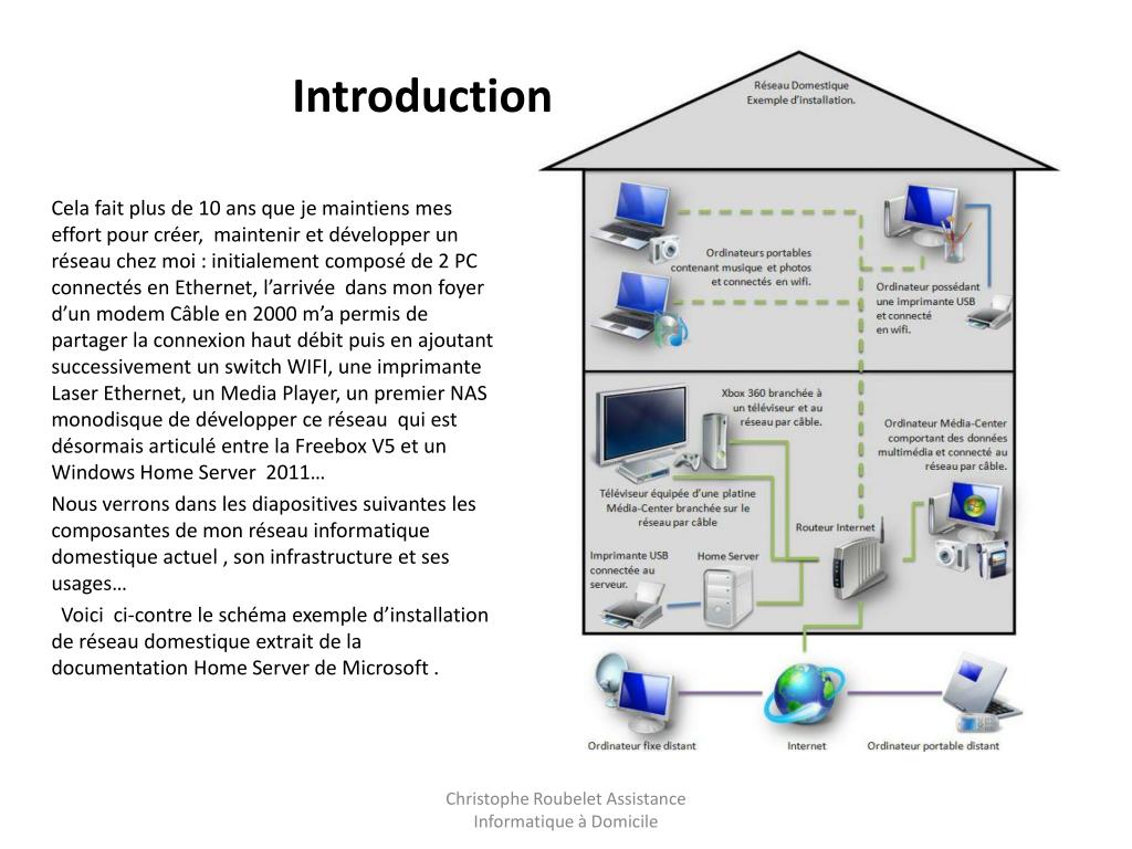 1. Introduction Cela fait plus de 10 ans que je maintiens mes effort pour créer, maintenir et développer un réseau chez moi : initialement composé de 2 PC connectés en Ethernet, l’arrivée dans mon foyer d’un modem Câble en 2000 m’a permis de partager la connexion haut débit puis en ajoutant successivement un switch WIFI, une imprimante Laser Ethernet, un Media Player, un premier NAS monodisquede développer ce réseau qui est désormais articulé entre la Freebox V5 et un Windows Home Server 2011… Nous verrons dans les diapositives suivantes les composantes de mon réseau informatique domestique actuel , son infrastructure et ses usages… Voici ci-contre le schéma exemple d’installation de réseau domestique extrait de la documentation Home Server de Microsoft . Christophe Roubelet Assistance Informatique à Domicile