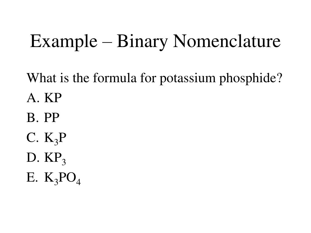 Example – Binary Nomenclature What is the formula for potassium phosphide? • KP • PP • K3P • KP3 • K3PO4