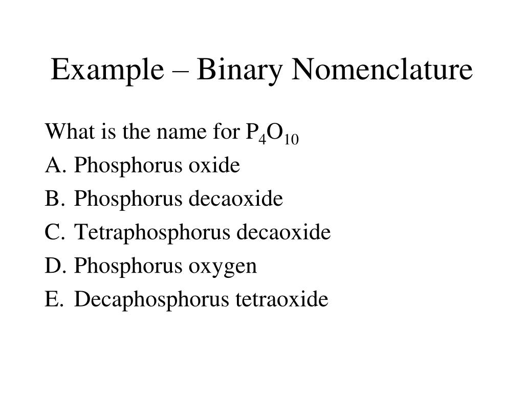 Example – Binary Nomenclature What is the name for P4O10 • Phosphorus oxide • Phosphorus decaoxide • Tetraphosphorusdecaoxide • Phosphorus oxygen • Decaphosphorustetraoxide