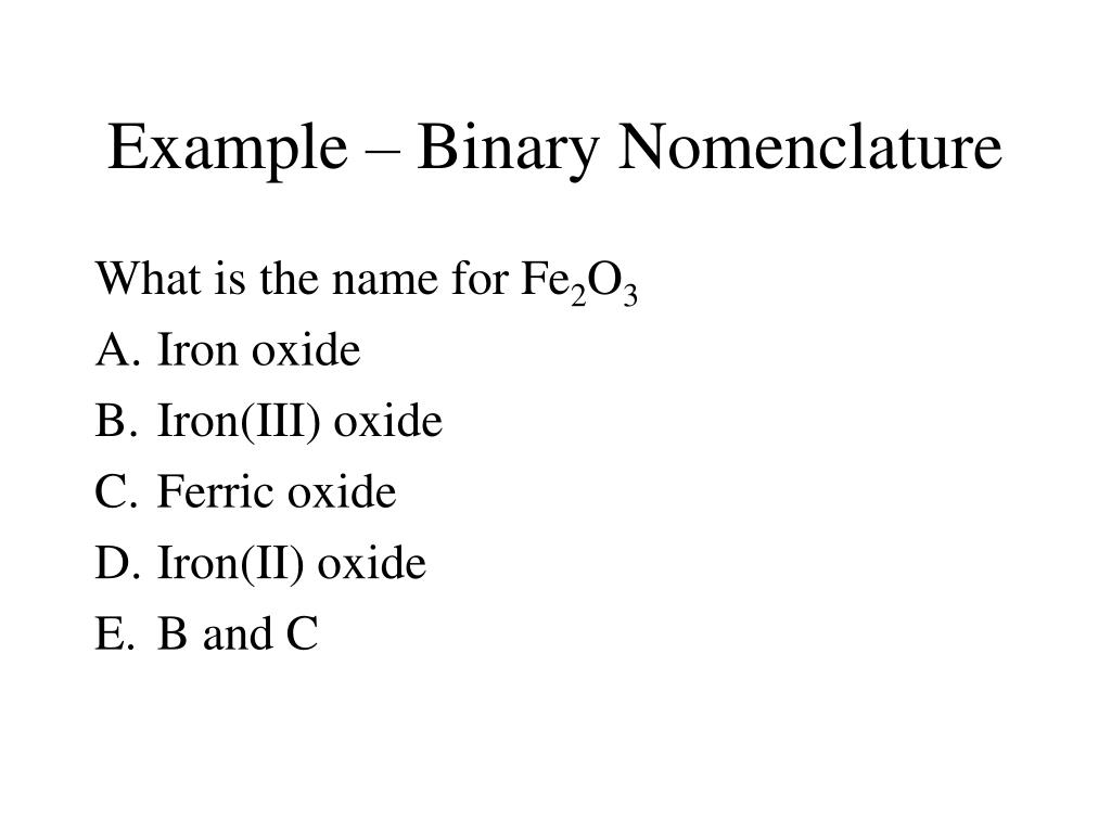 Example – Binary Nomenclature What is the name for Fe2O3 • Iron oxide • Iron(III) oxide • Ferric oxide • Iron(II) oxide • B and C