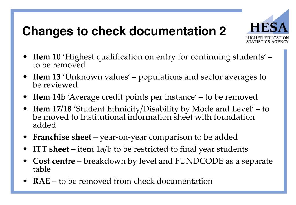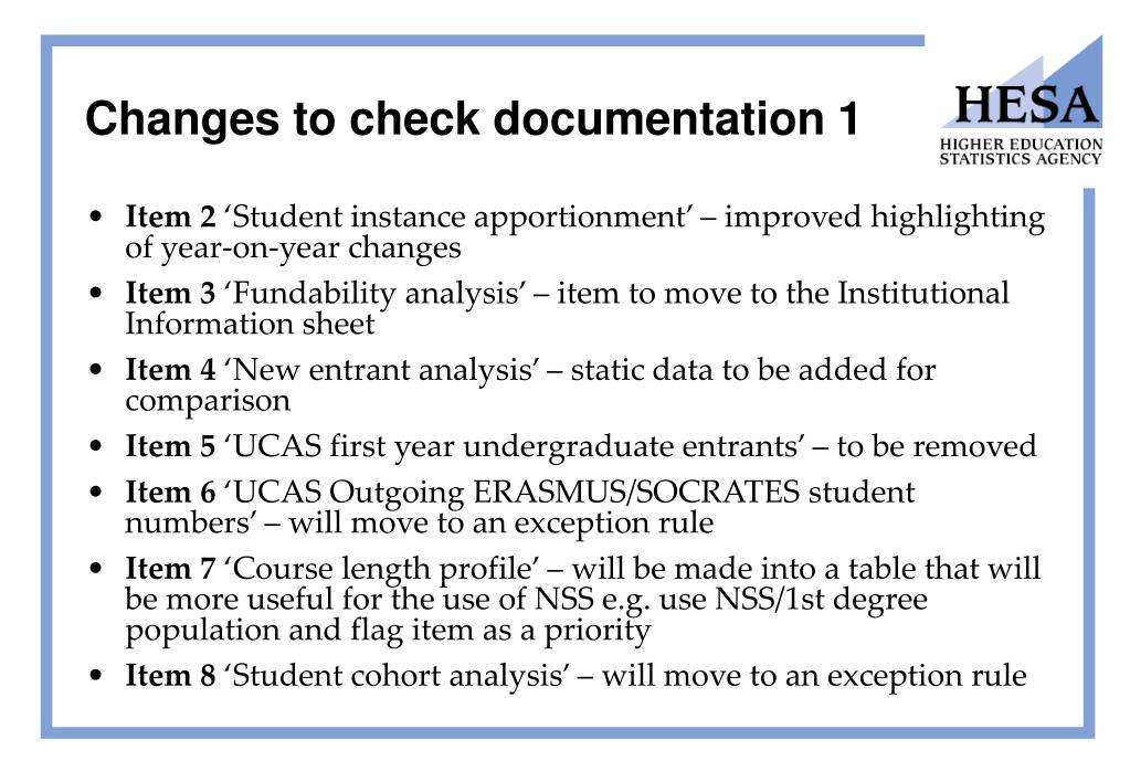 Changes to check documentation 1 • Item 2 ‘Student instance apportionment’ – improved highlighting of year-on-year changes • Item 3 ‘Fundability analysis’ – item to move to the Institutional Information sheet • Item 4 ‘New entrant analysis’ – static data to be added for comparison • Item 5 ‘UCAS first year undergraduate entrants’ – to be removed • Item 6 ‘UCAS Outgoing ERASMUS/SOCRATES student numbers’ – will move to an exception rule • Item 7 ‘Course length profile’ – will be made into a table that will be more useful for the use of NSS e.g. use NSS/1st degree population and flag item as a priority • Item 8 ‘Student cohort analysis’ – will move to an exception rule