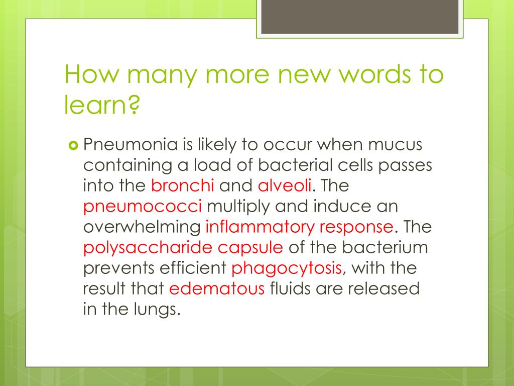 How many more new words to learn? • Pneumonia is likely to occur when mucus containing a load of bacterial cells passes into the bronchi and alveoli. The pneumococci multiply and induce an overwhelming inflammatory response. The polysaccharide capsule of the bacterium prevents efficient phagocytosis, with the result that edematous fluids are released in the lungs.