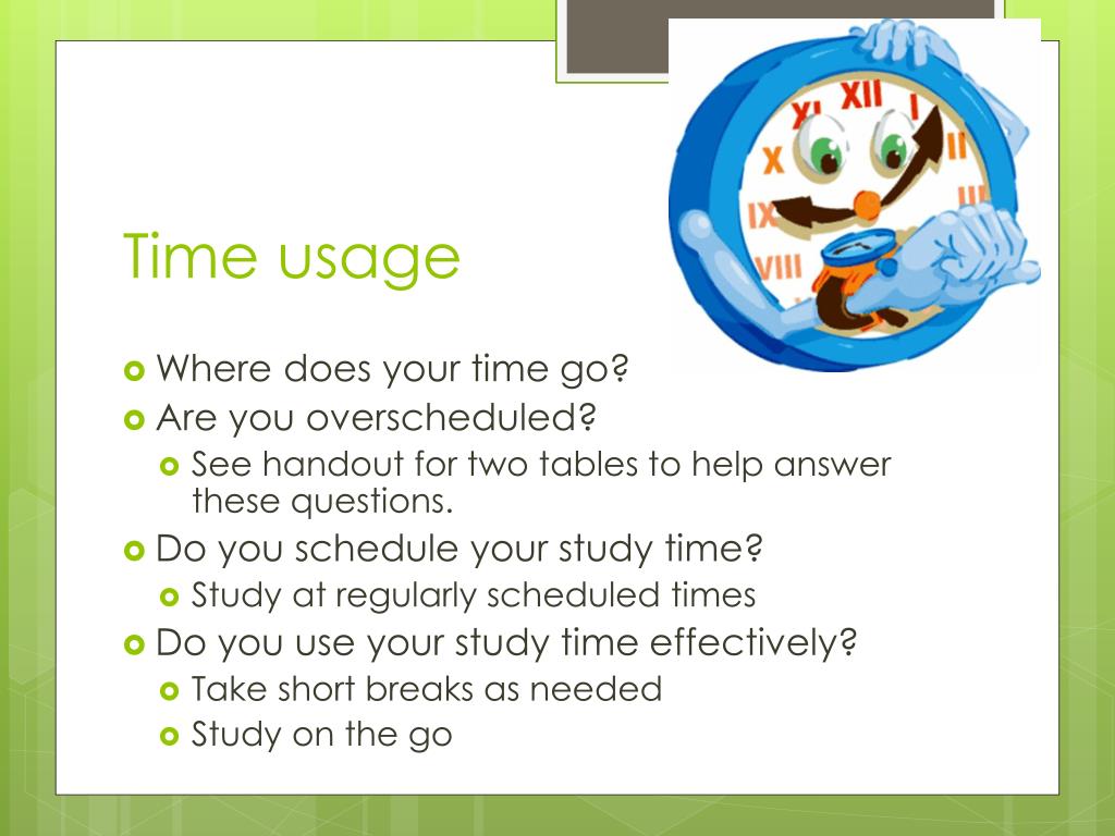 Time usage • Where does your time go? • Are you overscheduled? • See handout for two tables to help answer these questions. • Do you schedule your study time? • Study at regularly scheduled times • Do you use your study time effectively? • Take short breaks as needed • Study on the go