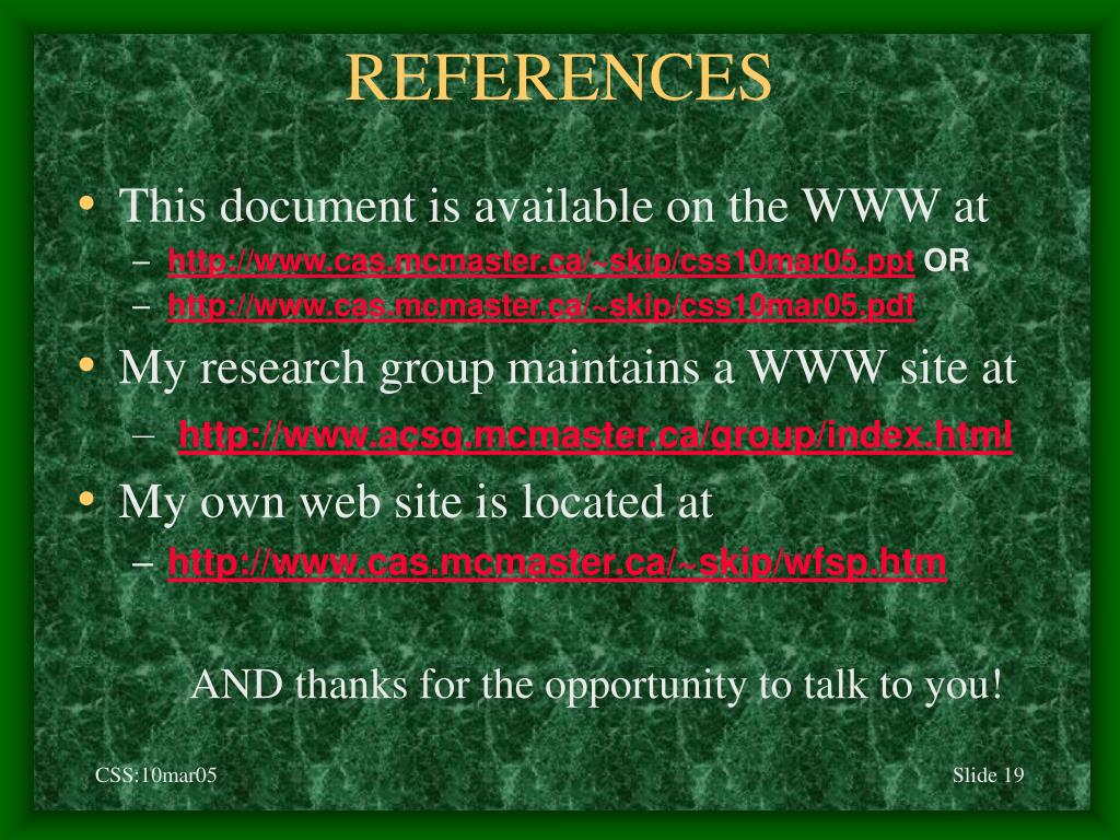 REFERENCES • This document is available on the WWW at • http://www.cas.mcmaster.ca/~skip/css10mar05.ppt OR • http://www.cas.mcmaster.ca/~skip/css10mar05.pdf • My research group maintains a WWW site at • http://www.acsg.mcmaster.ca/group/index.html • My own web site is located at • http://www.cas.mcmaster.ca/~skip/wfsp.htm AND thanks for the opportunity to talk to you!