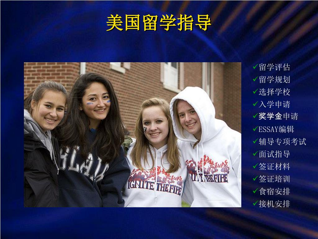 美国留学指导 • 留学评估 • 留学规划 • 选择学校 • 入学申请 • 奖学金申请 • ESSAY编辑 • 辅导专项考试 • 面试指导 • 签证材料 • 签证培训 • 食宿安排 • 接机安排