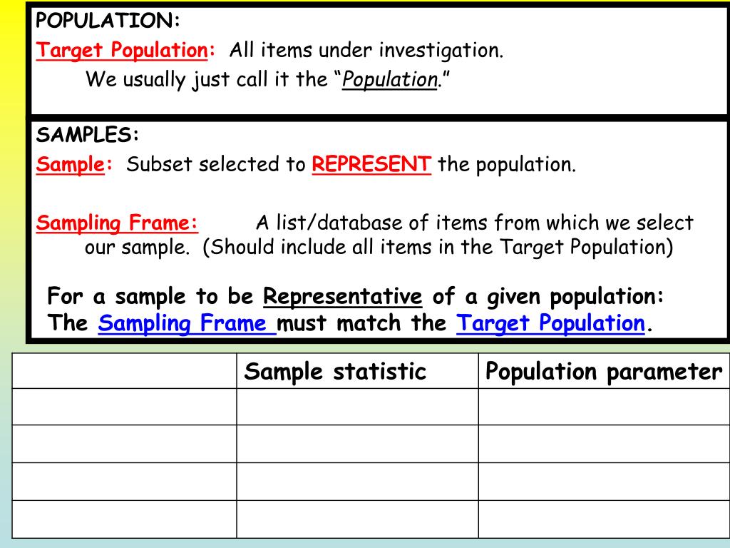POPULATION: Target Population: All items under investigation. We usually just call it the “Population.” SAMPLES: Sample: Subset selected to REPRESENT the population. Sampling Frame:A list/database of items from which we select our sample. (Should include all items in the Target Population) For a sample to be Representative of a given population: The Sampling Frame must match the Target Population.