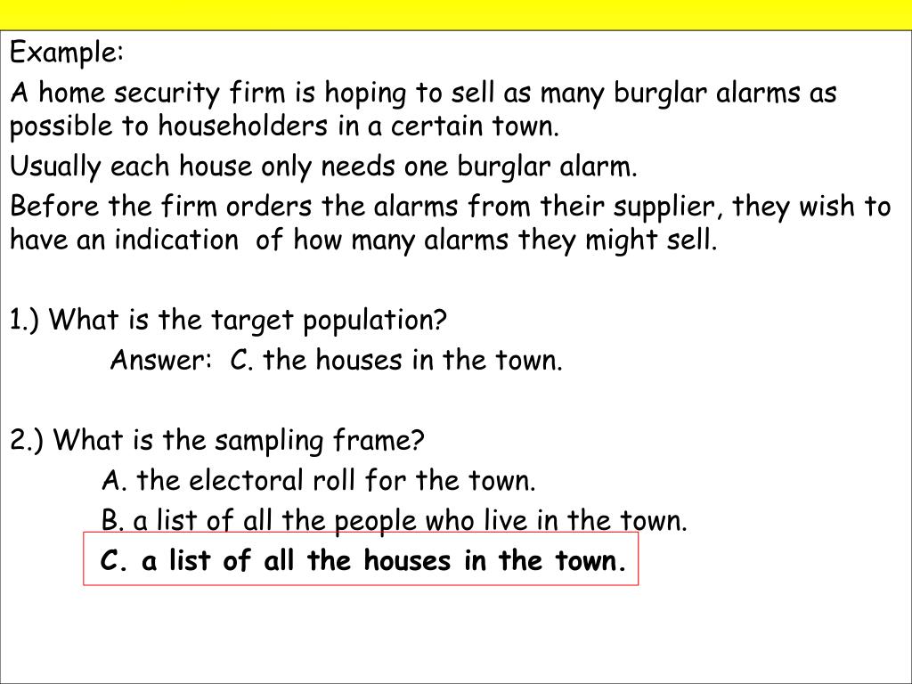 Example: A home security firm is hoping to sell as many burglar alarms as possible to householders in a certain town. Usually each house only needs one burglar alarm. Before the firm orders the alarms from their supplier, they wish to have an indication of how many alarms they might sell. 1.) What is the target population? Answer: C. the houses in the town. 2.) What is the sampling frame? A. the electoral roll for the town. B. a list of all the people who live in the town. C. a list of all the houses in the town.