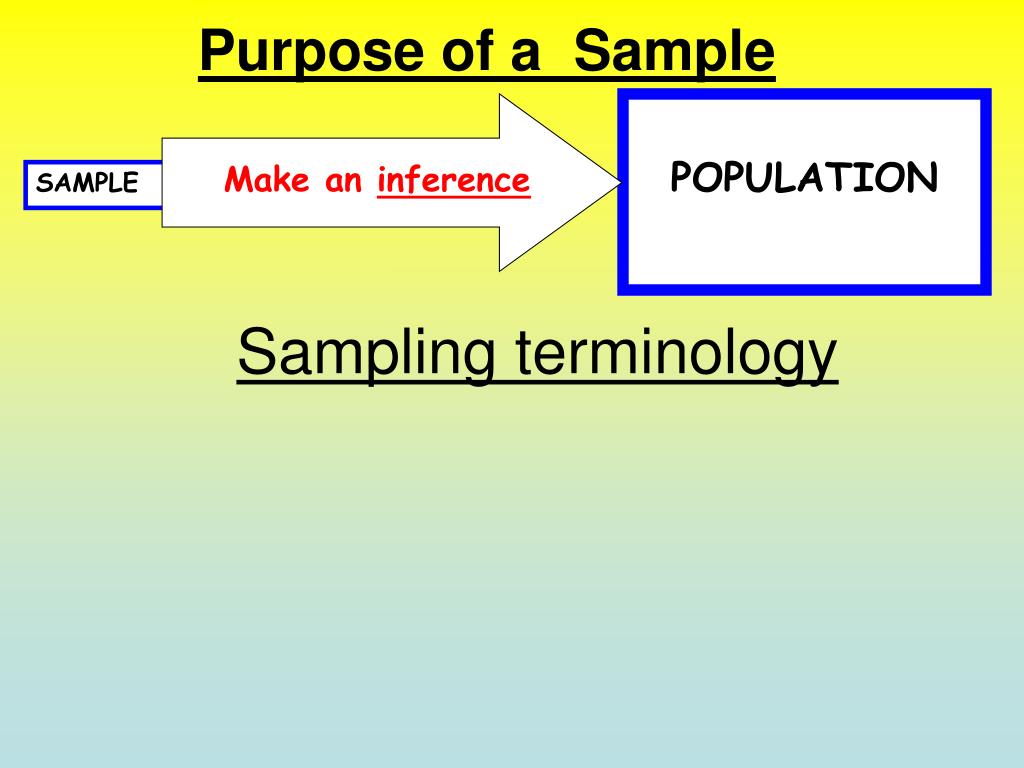 Purpose of a Sample POPULATION Make an inference Inferences SAMPLE Sampling terminology