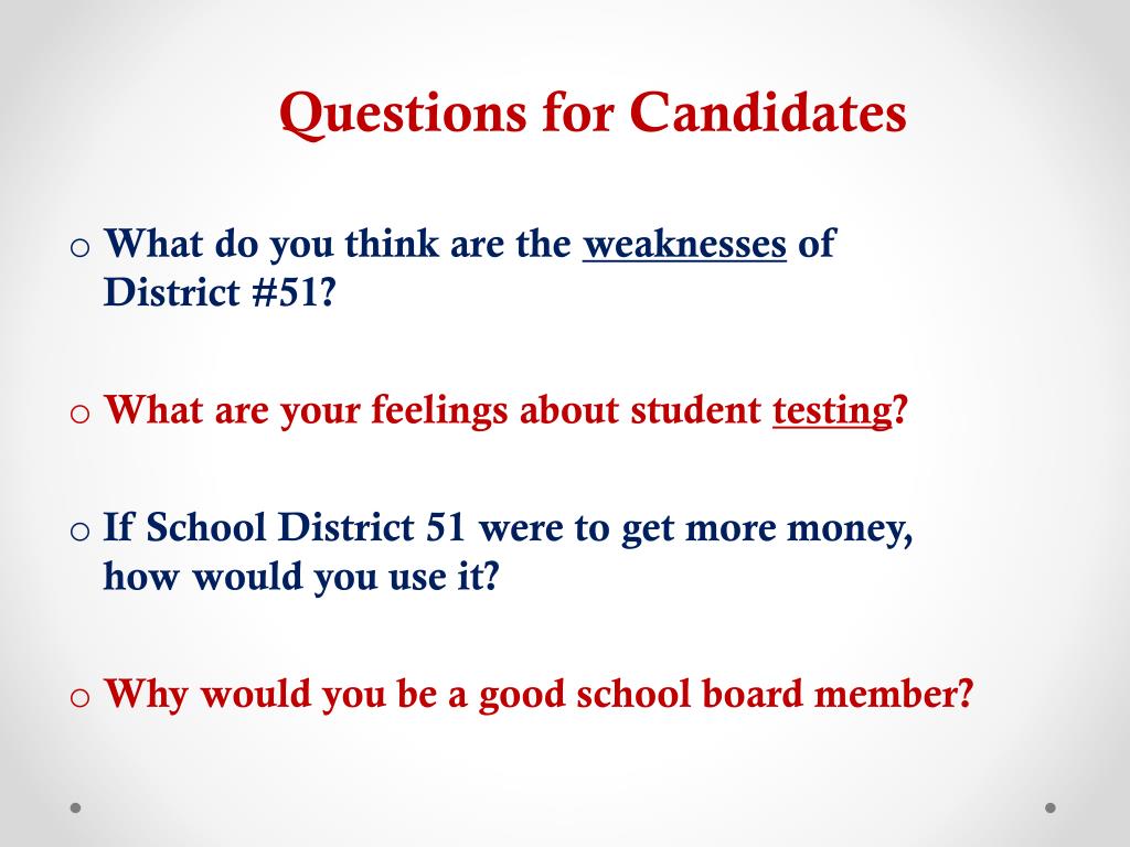 Questions for Candidates • What do you think are the weaknessesof District #51? • What are your feelings about student testing? • If School District 51 were to get more money, how would you use it? • Why would you be a good school board member?