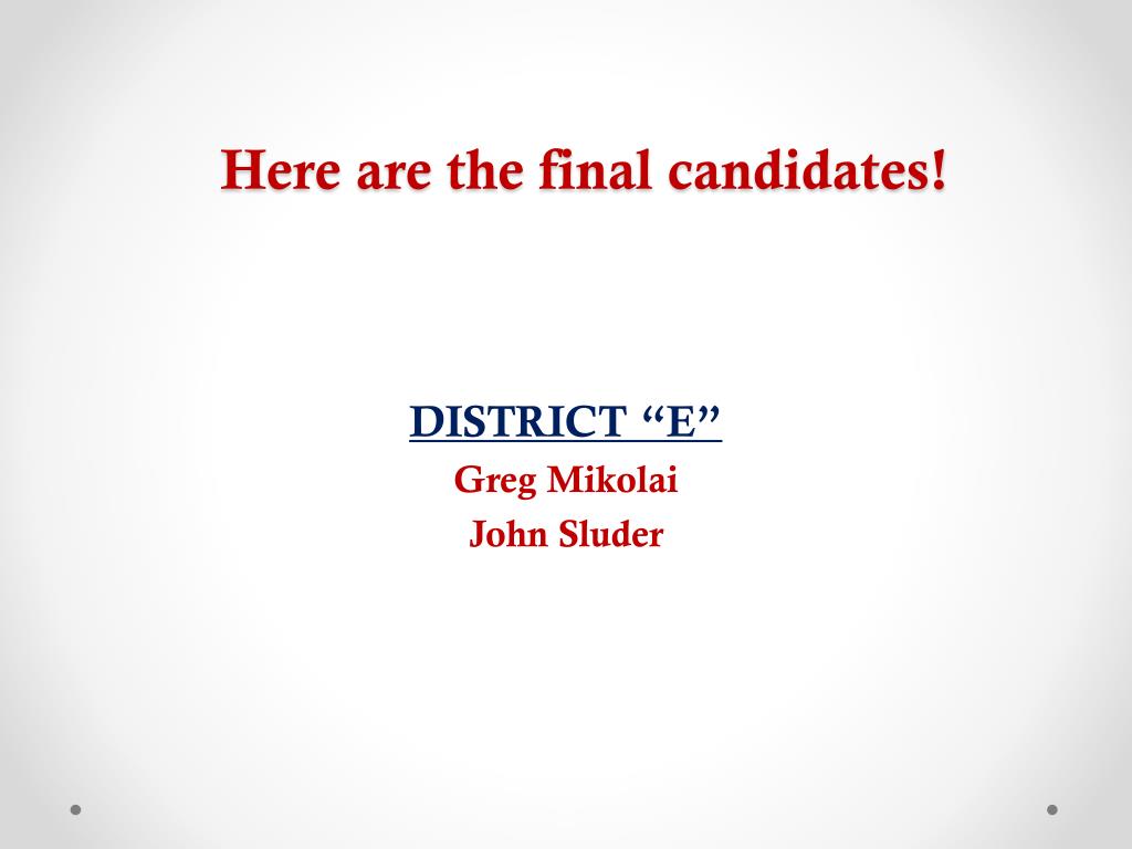 Here are the final candidates! DISTRICT “E” Greg Mikolai John Sluder